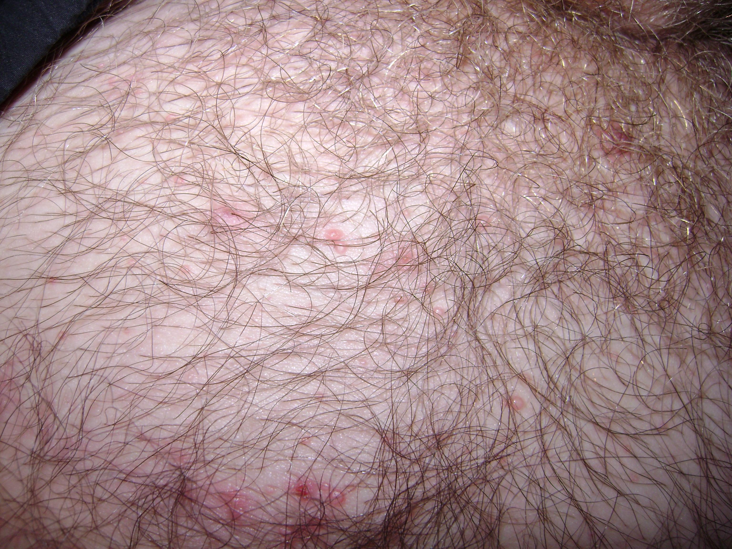 Здравствуйте. 1-2 недели назад появилась сыпь на лобке в виде прыщиков, некоторые больше похожи на угри или пузырики диаметром 1-2 мм. Не болят, не чешутся, дискомфорта нет. Но и не проходят. Один как то стал чесать и "расчесал". На фото видно. Что это может быть? Заранее спасибо.