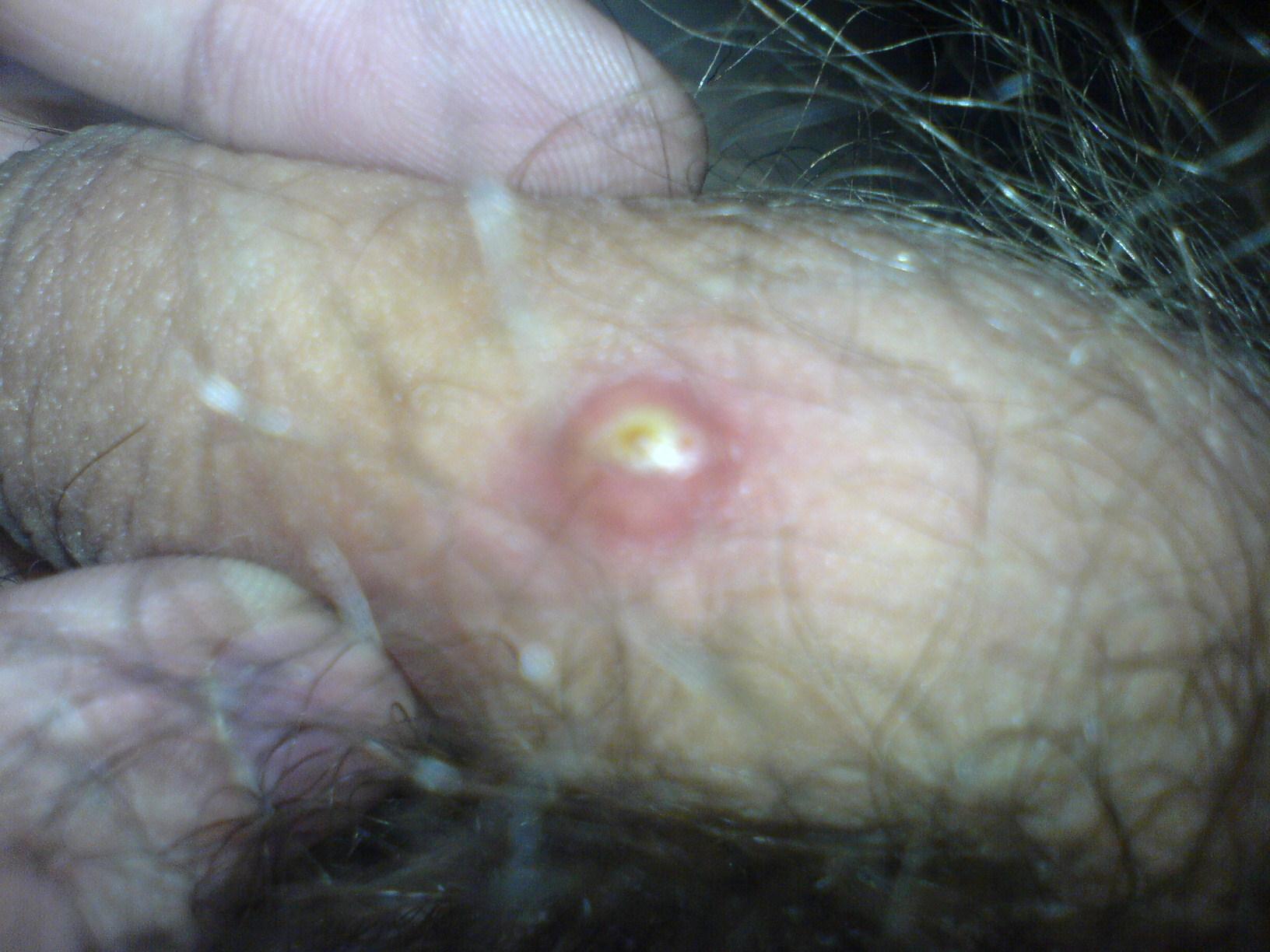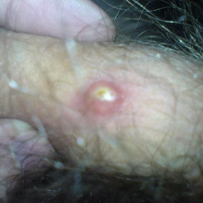Здравствуйте. Давным давно появилась маленькая точка белая, а вот совсем недавно превратилась в очень большой красный волдырь с белым в центром. На пенисе. Подскажите пожалуйста как это лечить?