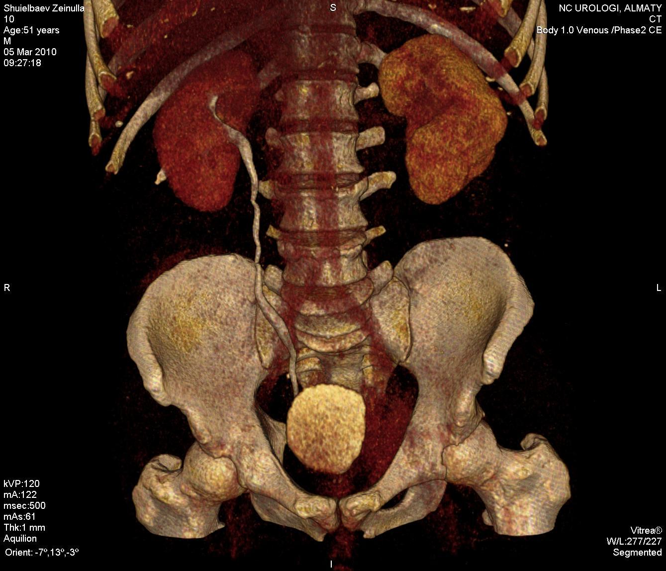 В мочевом пузыре по задней левой боковой стенке определяется образование размером 6,0*2,4 см. с четкими, бугристыми контурами имеющими экзо и эндофитный рост прорастающий в левый семенной пузырек, в левый мочетотечник и в параректальную клетчатку. Тазовый лимфоузел увеличен до 1,3 см. Костные структуры таза без особенностей. Заключение: образование мочевого пузыря, Mts в тазовый лимфоузел.. Жировой гепатоз. Хр. холецистит.
