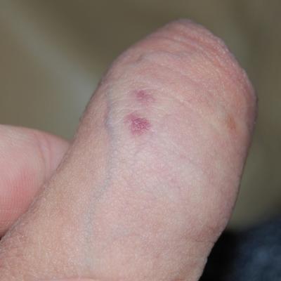 Доктор, здравствуйте. Сегодня на коже полового члена обнаружил 2 красных округлых пятнышка. Боли при моче испускании, да и боли вообще нет. Около месяца назад был петтинг без соприкосновения половых органов, половая жизнь не очень активная, а если и активная то с кондомом.