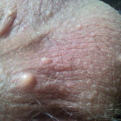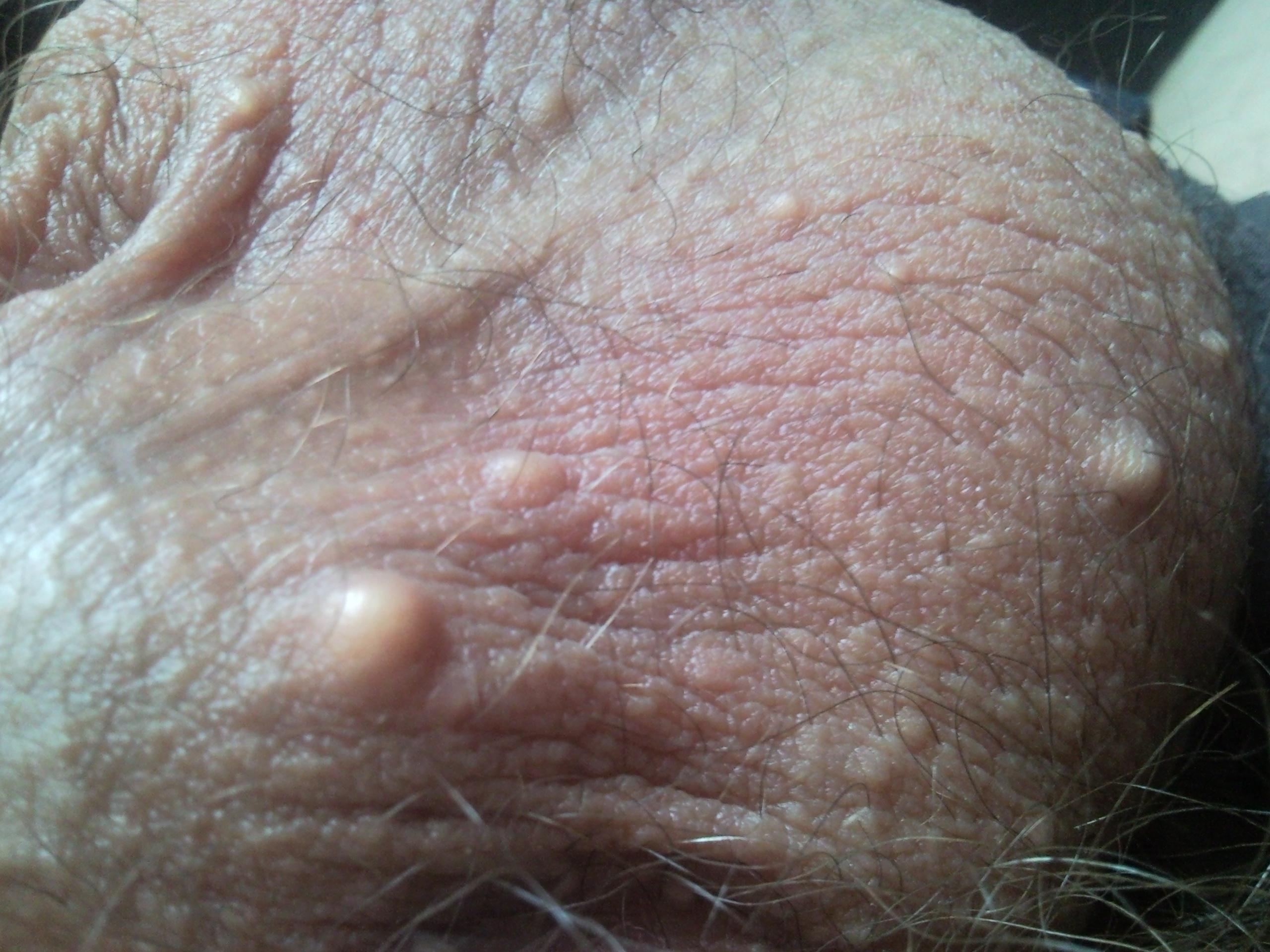 на мошонке белые прыщики, на ощупь твердые не выдавливаются, никак не беспокоят.Появили уже давно, как это убрать?