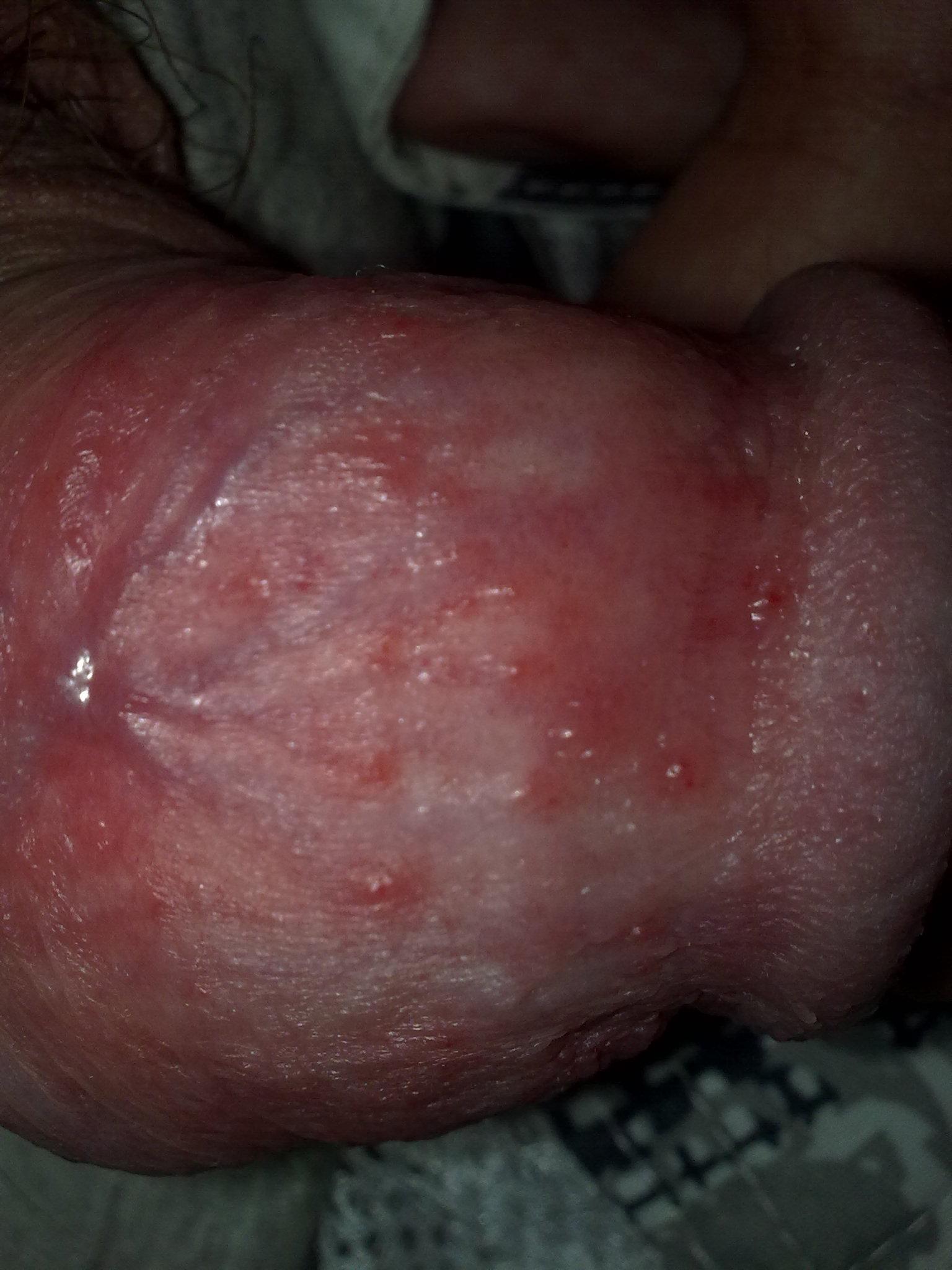 Здравствуйте, мне 19 лет, недавно заметил сыпь вокруг головки и под ней на половом члене. Недавно занимался сексом со своей девушкой (у нас был первый раз, она девственница, поэтому в ней уверен), примерно после чего и обнаружил эту сыпь. Никакого дискомфорта, болей при мочеиспускании нет, при семяизвержении тоже. всё вобщем-то нормально, но есть лёгкий зуд, почти незаметный, до сегодняшнего дня не беспокоил вообще (обнаружил дня 3-4 назад). Пожалуйста скажите, если можете, что это? фото прилагаются.