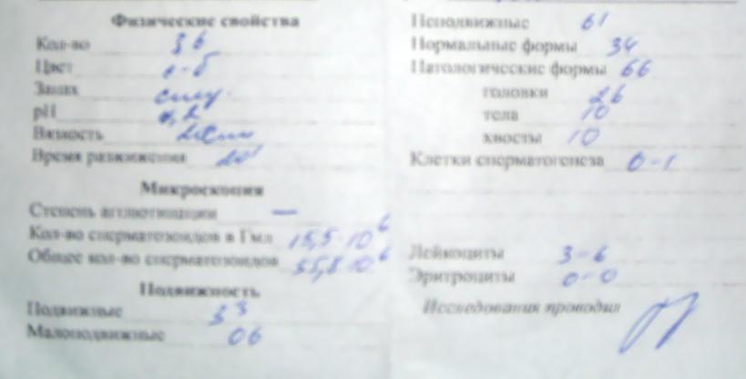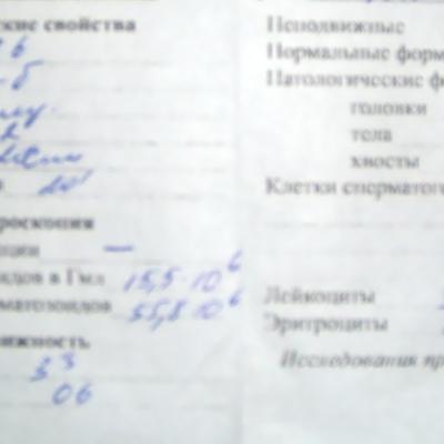 Здравствуйте, помогите, пожалуйста, расшифровать спермограмму. Возможно ли, зачать ребенка с таким анализом? Заранее благодарна. Кол-во 3,6, цвет с-б, запах спец., ph7,2, вязкость 2, время разжижения 20 мин. Кол-во 15,5 млн. Общее кол-во 55,8млн. Подвижные 33, малоподвижных 06, неподвижных 61,нормальные формы 34, патологические формы 66, головки 26, тела10, хвосты 10, клетки сперматогенеза 0-1. Лейкоциты 3-6, эритроциты 0-0.