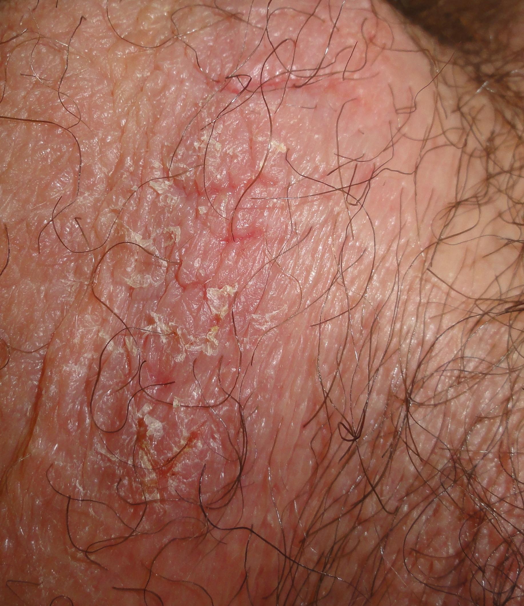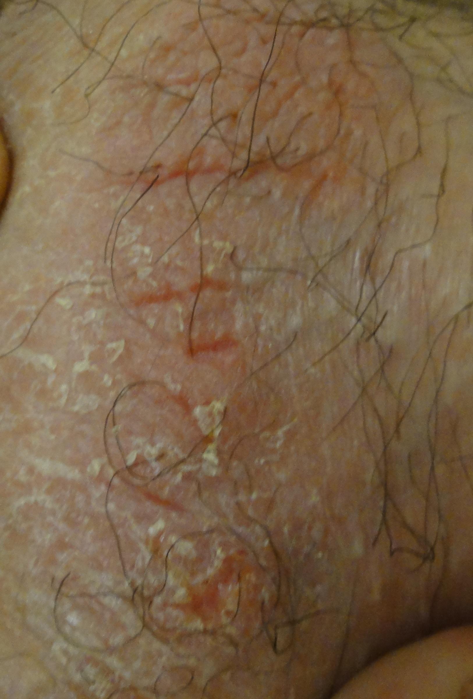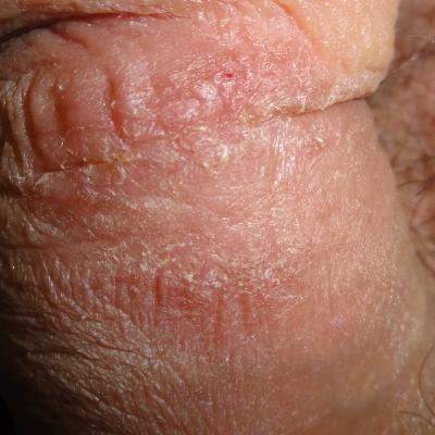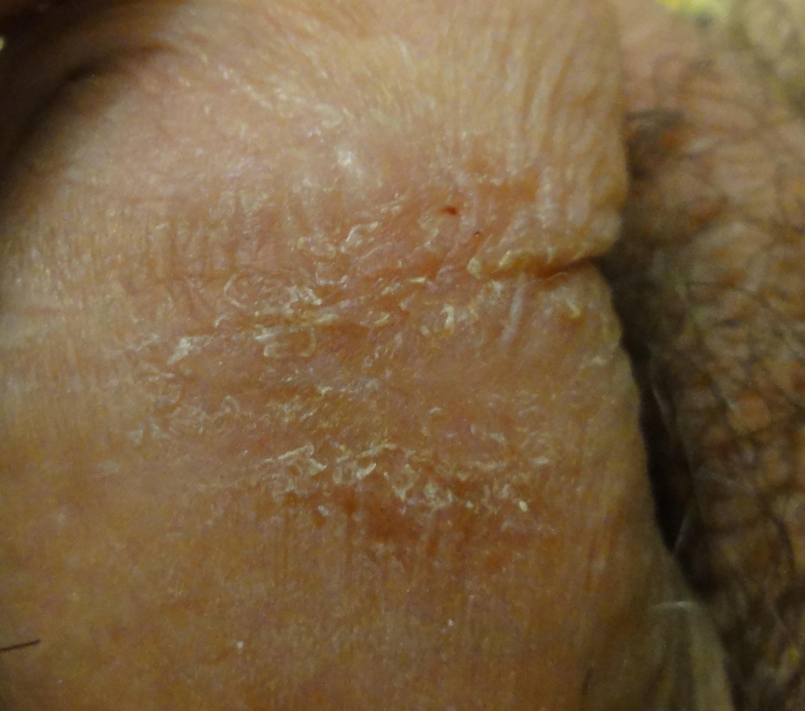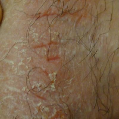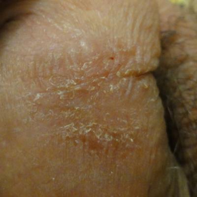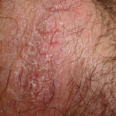 На мошонке с правой стороны шелушится и облазит кожа, кожа стягивается и потом в местах стягивания образуются трещины, которые потом чешутся. Неприятного запаха нет. Теперь вот после того как подрочил на члене (не на головке) появилось такая же беда, кожа как бы стянулась.