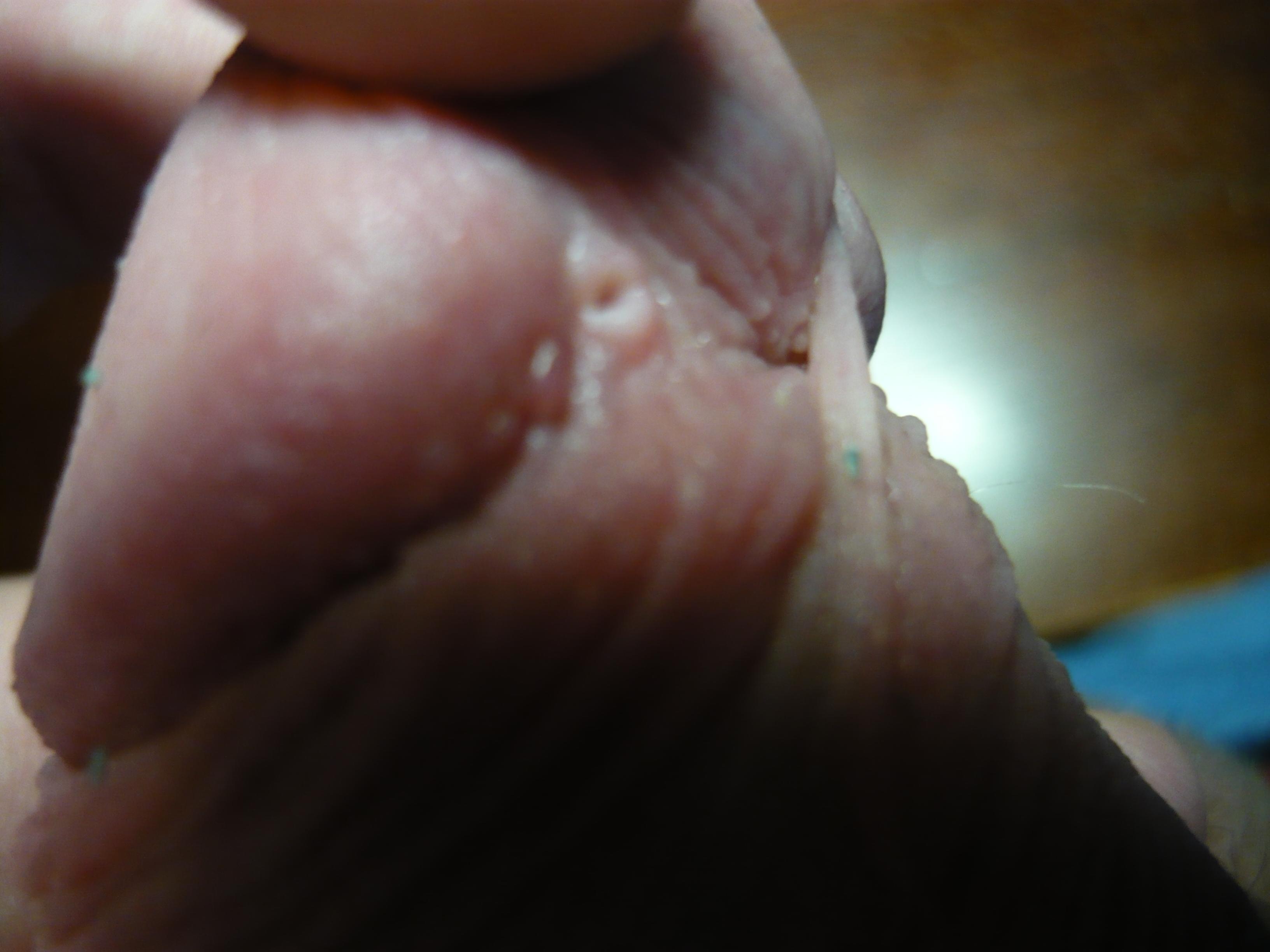Добрый день.Я девственник и у меня под головкой полового члена уже давно вскочил,не знаю как назвать,похож на лопнувший прыщик с дырочкой по середине.Так не беспокоит,но при надавливании возникают болевые ощущения и при мастурбации сначала тоже.Скажите пожалуйста,что это может быть?