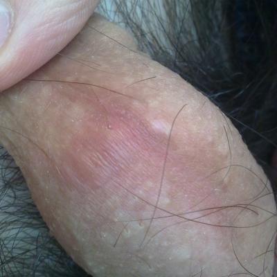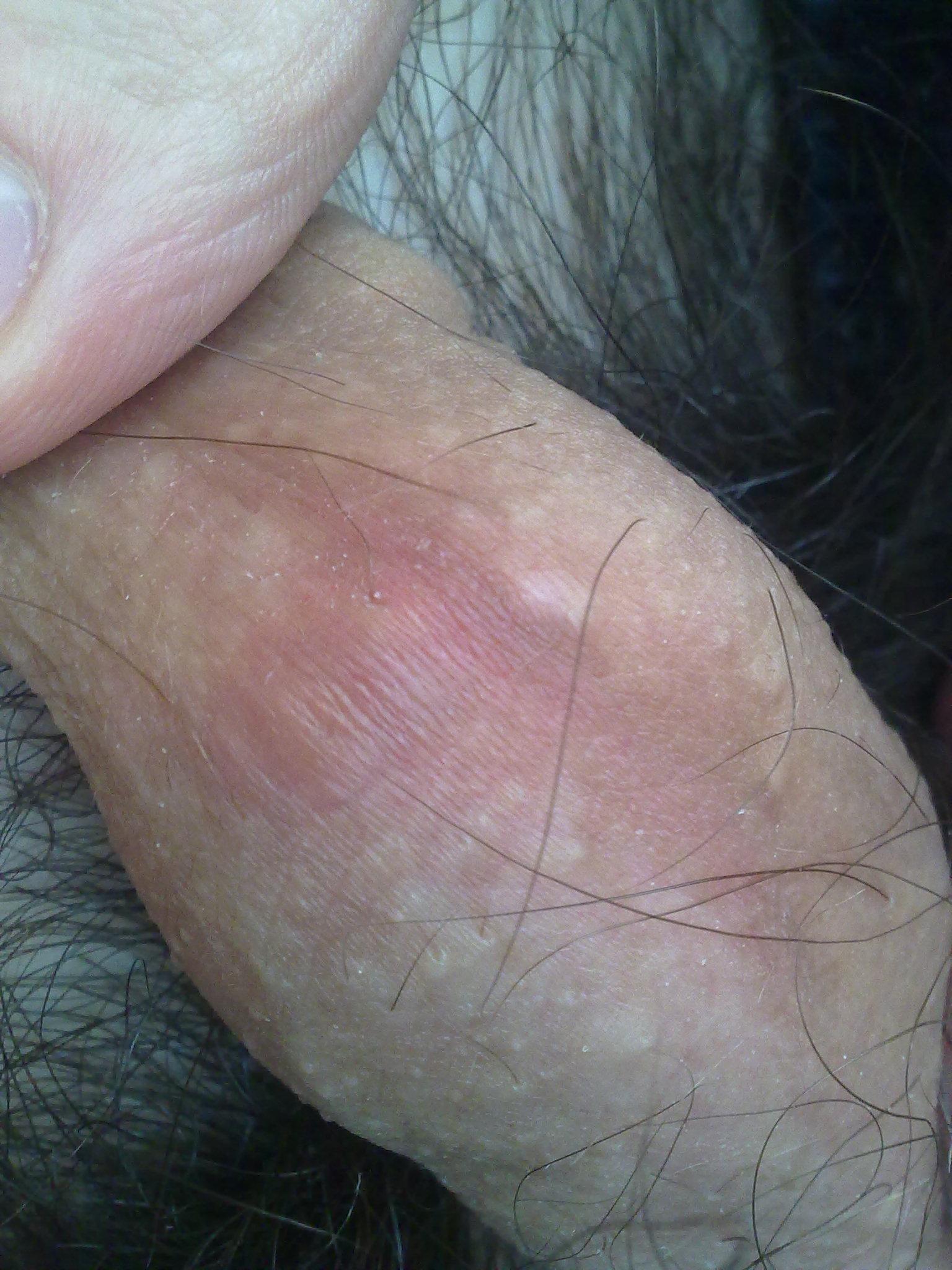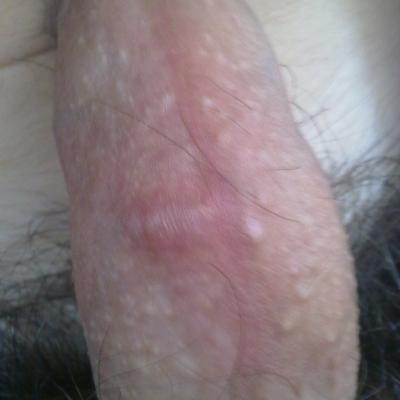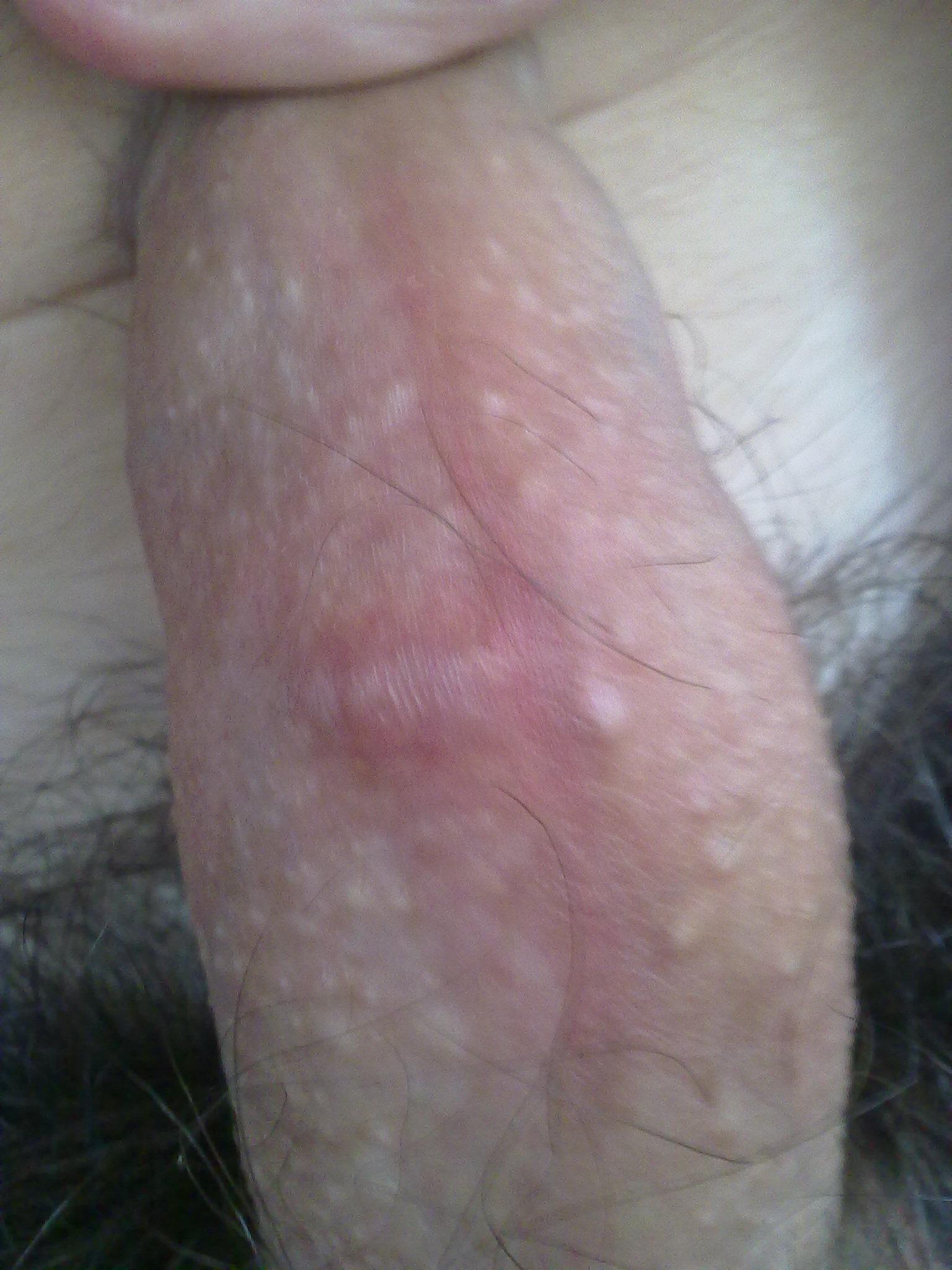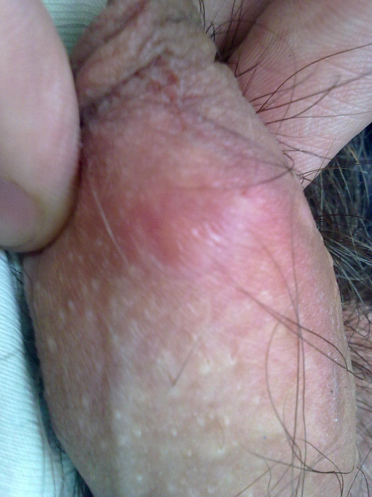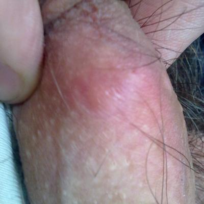 Здравствуйте, у меня недавно появилась шишка на члене, небольшая, красная, если трогаешь, то болит. Скажите пожалуйтса что это может быть? фото прилагается..