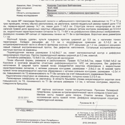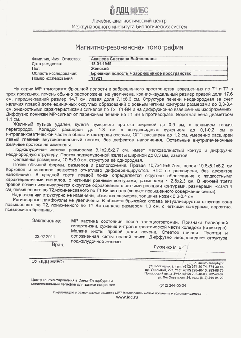 Здравствуйте, у моей мамы на УЗИ обнаружили кисту почки (ей 62 года), позже она сделала МРТ, вот, что написано в заключении: МР картина состояния после холецистэктомии. Признаки билиарной гипертензии, сужение интрапанкреатической части холедоха (стриктура). Мелкие кисты правой доли печени. Стеатоз печени. Простая и осложненная кисты правой почки. Диффузно неоднородная структура поджелудочной железы.