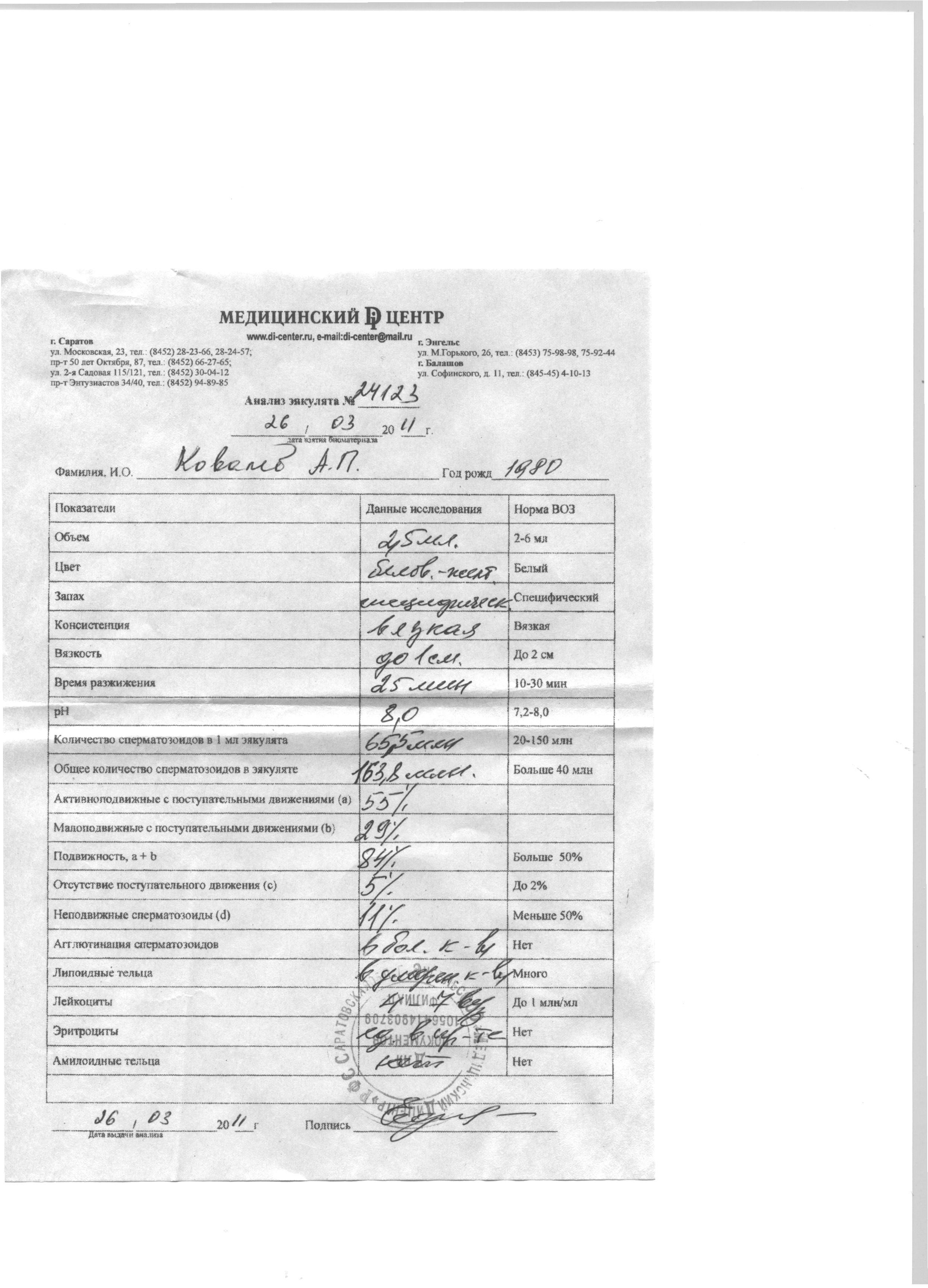 Доброго времени суток! Скажите пожалуйста, возможно ли зачатие при таких результатах анализа эякулята?