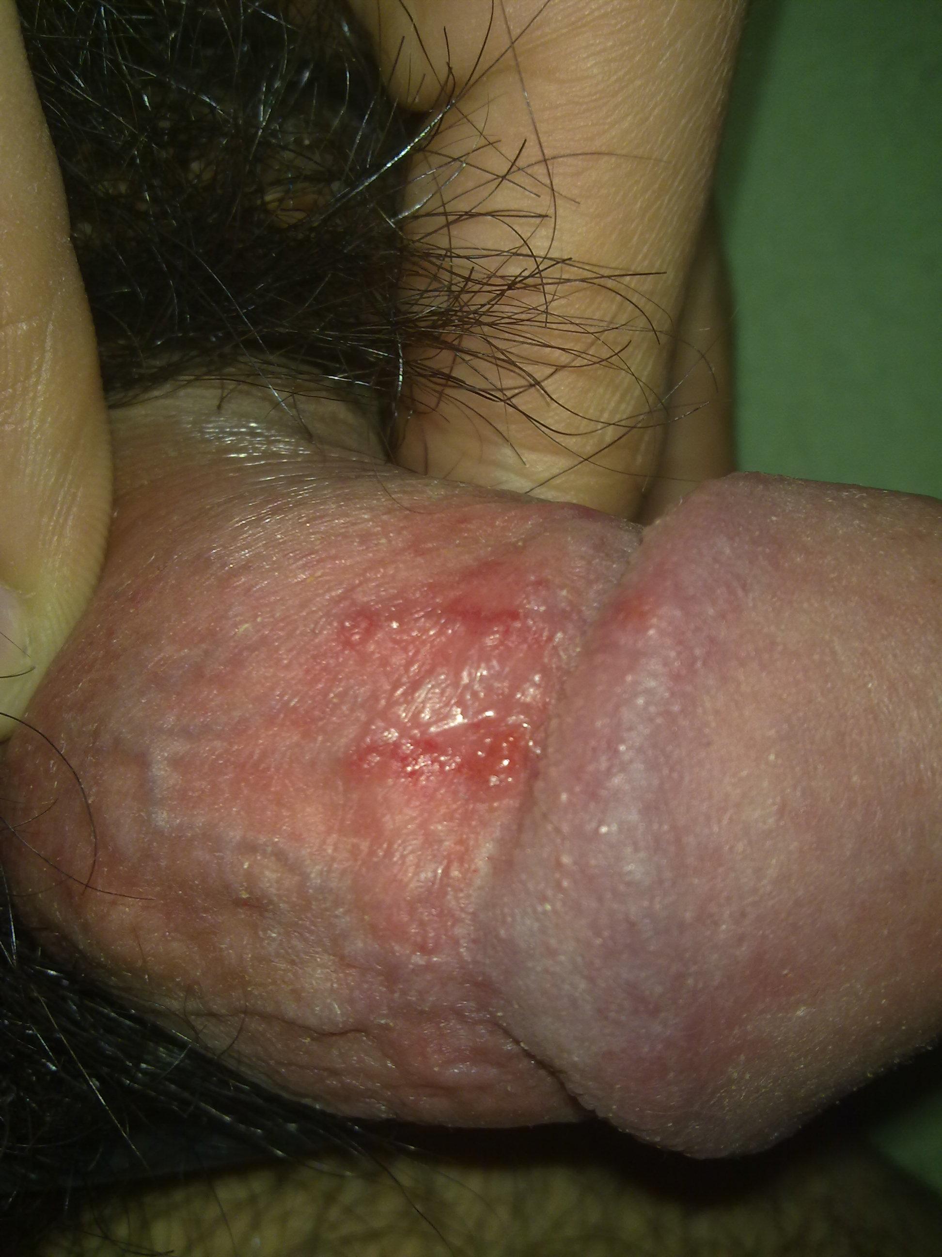 случайно обнаружил у себя вот такое покраснение толи воспаления,нету распловления или расхождения ткани ,не было половых связей,думаю на постит