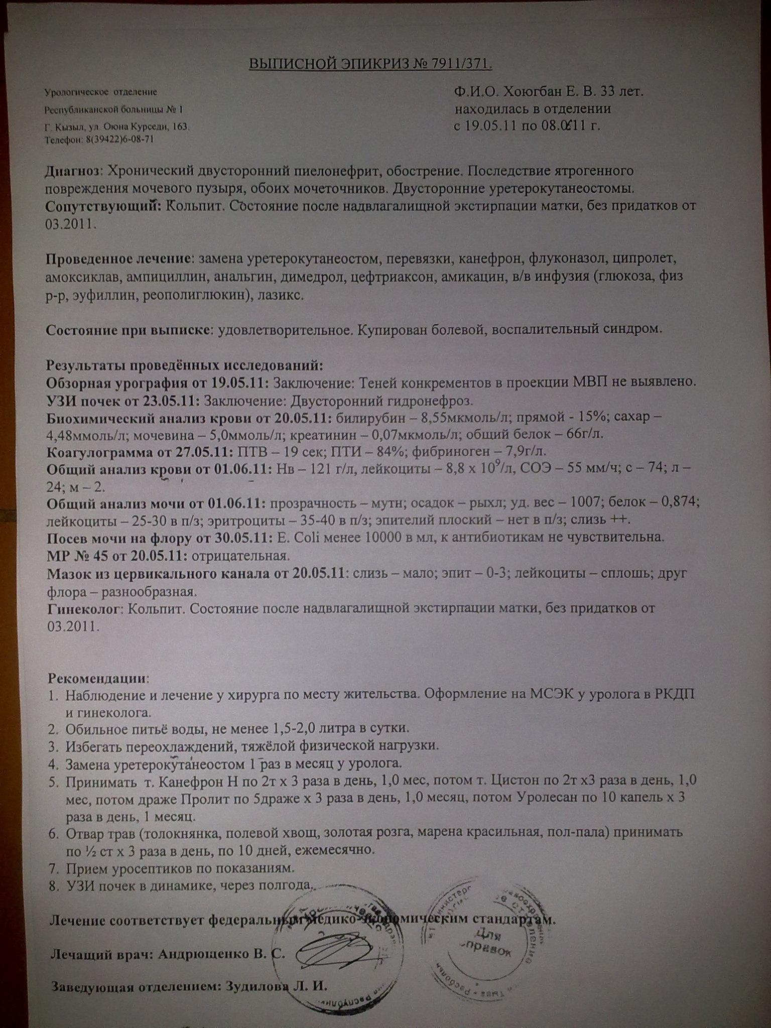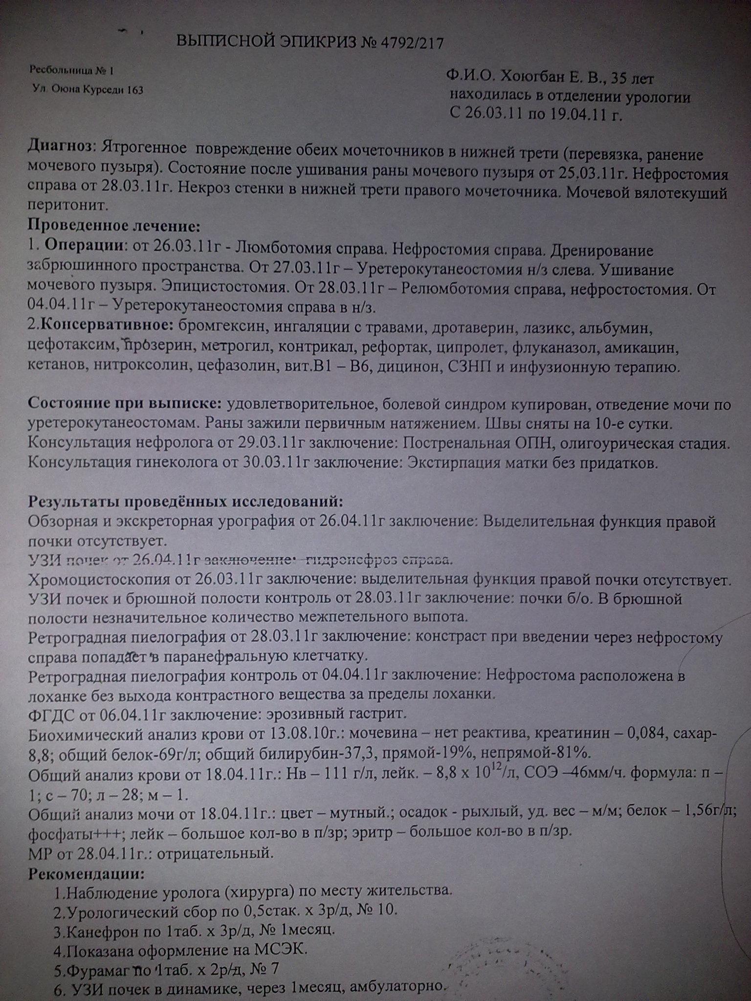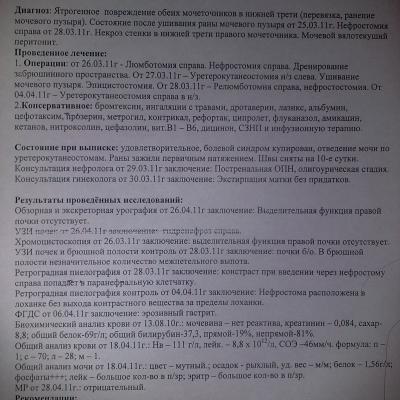 Здравствуйте! 24.03.2011 во время операции кесарева сечения моей сестры повредили мочевой пузырь. Прошла 6 операций, последняя была 04.04.2011. Назначили операцию через 3 месяца. Я слышала что предлагают ставить мочеточниковый стенд. Скажите, пожалуйста, сколько стоит такая операция?