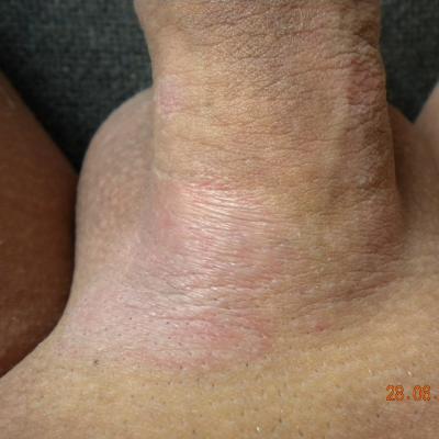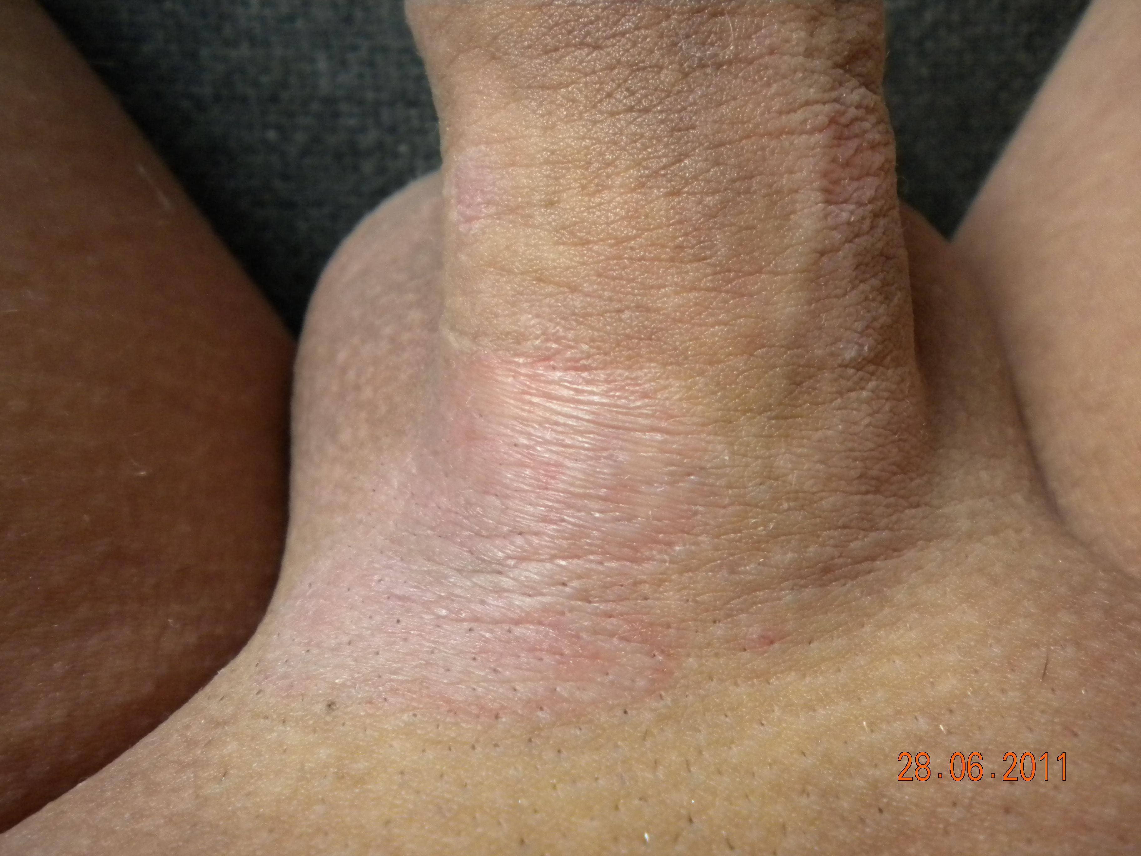 коричневатое пятно на головке и краснота у основания члена