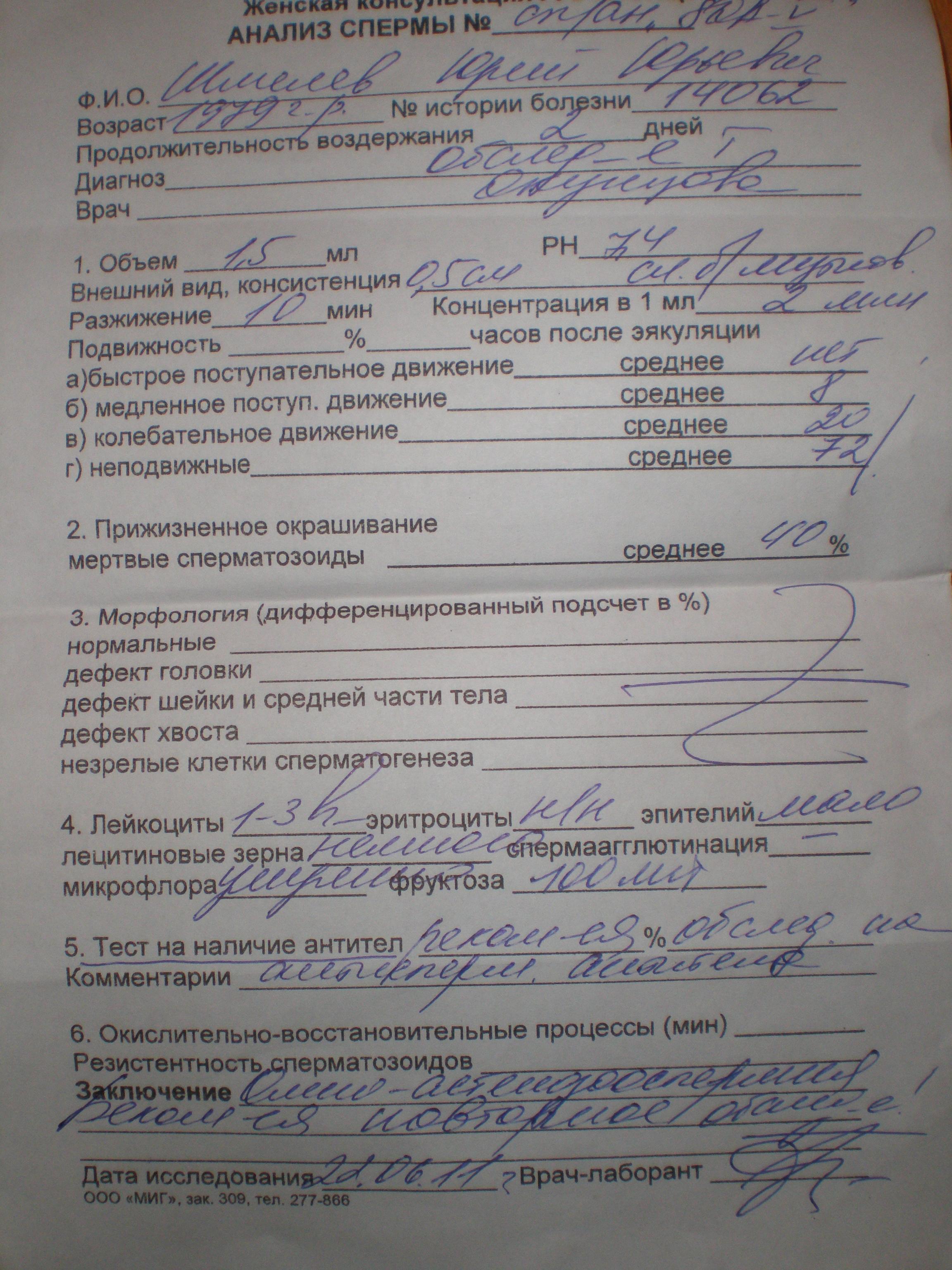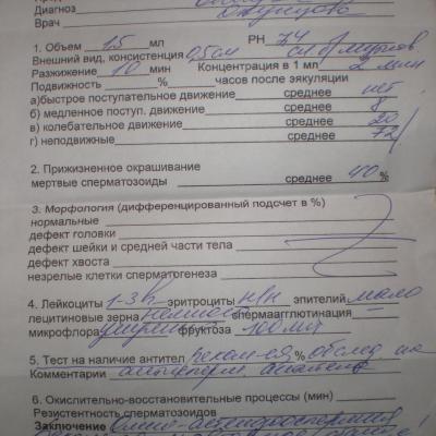 3. Лейкоциты 1-3Н, эритроциты - н/н, эпителий - мало, лецитиновые зерна -немного, спермаагглютинация -, микрофлора -умерен., фруктоза- 100м.