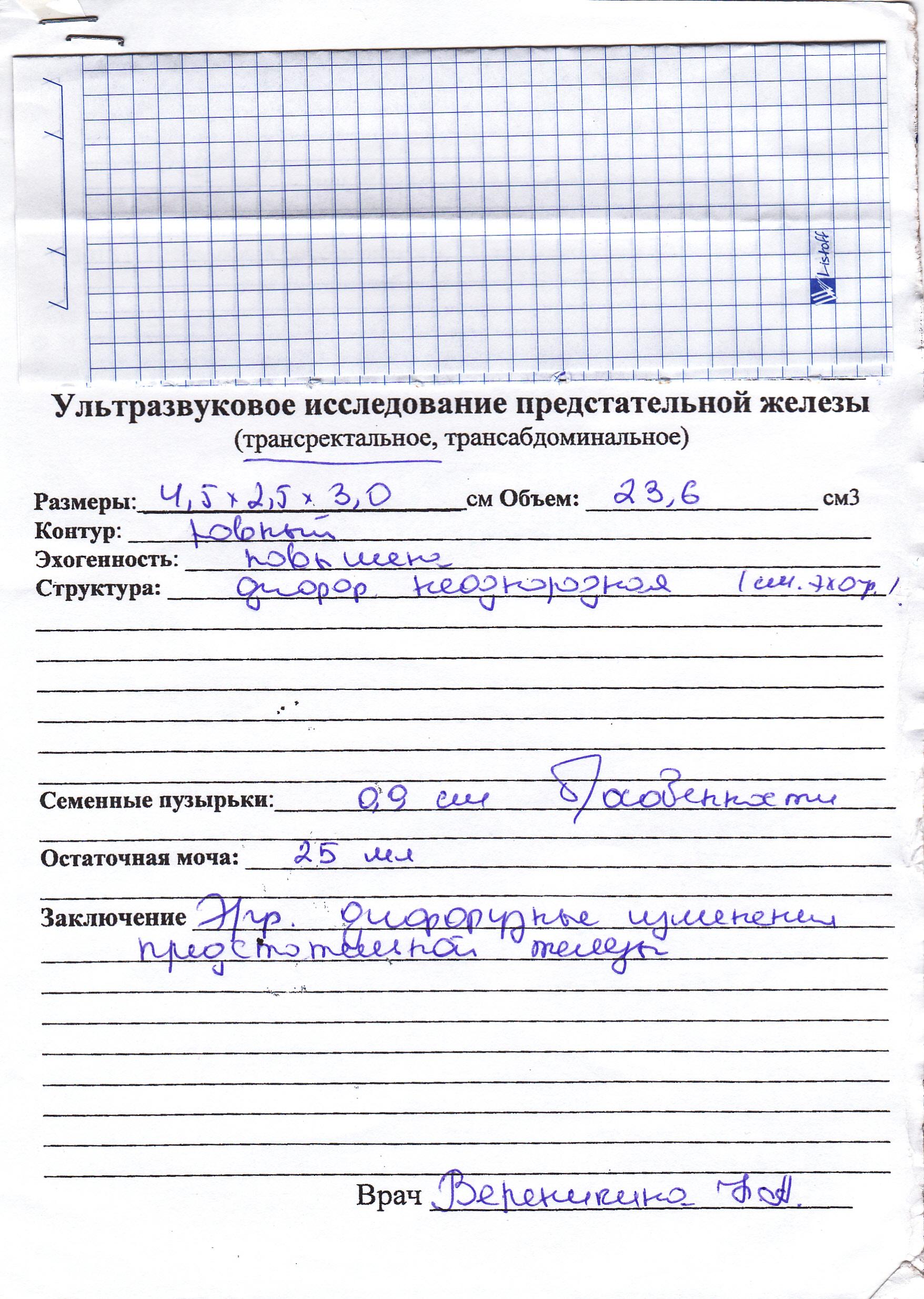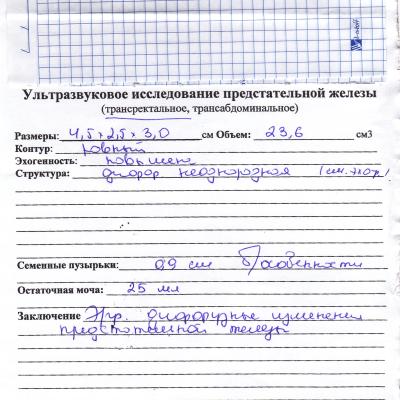 Здравствуйте! Прошу Вас посмотрите прикрепленные файлы, это результаты обсследования. Я переболел 4 раза простудой в этом году, один раз была трудность мочеиспускания из-за выпитого алкоголя, сейчас с мочеиспускания в порядке, но все же решил проверить простату. Обнаружилось небольшое воспаление и Врач назначил лечение: