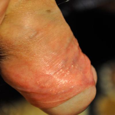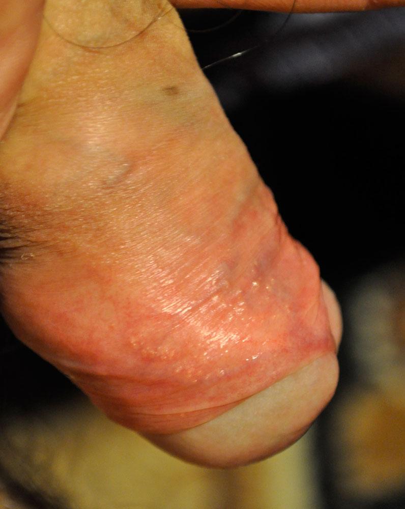 Здравствуйте! Помогите пожалуйста определить что за недуг. Никакого дискомфорта не причиняет. Заразился точно не половым путем. Симптомы проявляются уже больше года. Сыпь видна только на внутренней поверхности кожи, в основном снизу, позже стал замечать еще немного на краю головки. Фото прилагаю..