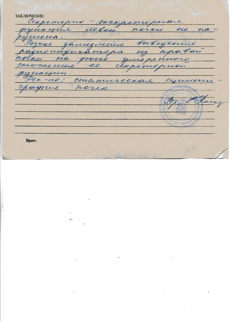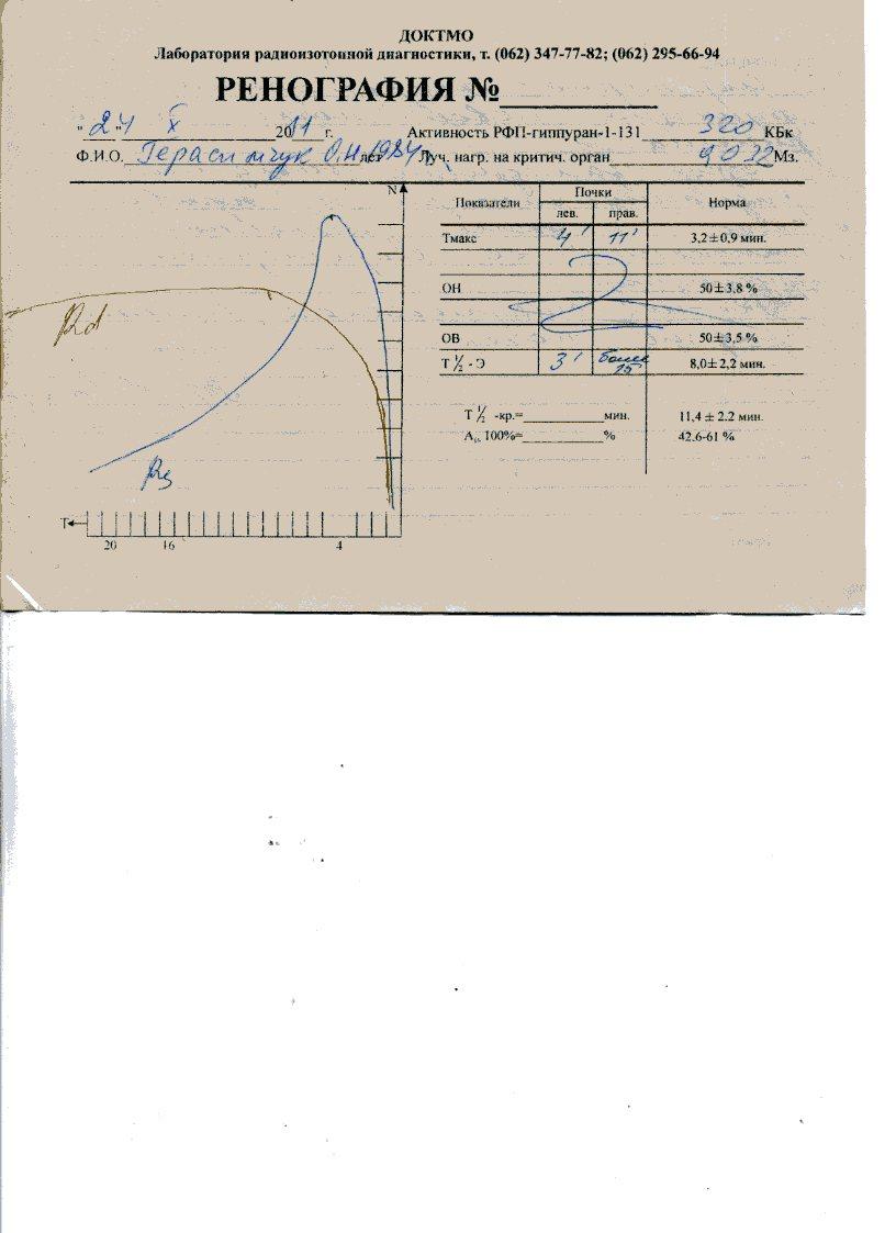правая почка обычной формы, 144*64 мм, с умеренным диффузным снижением концентрации РФП и мозаичным распределением в паренхиме. Функционально активная паренхима правой почки составляет 87% по сравнению с левой.