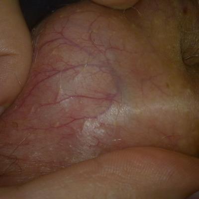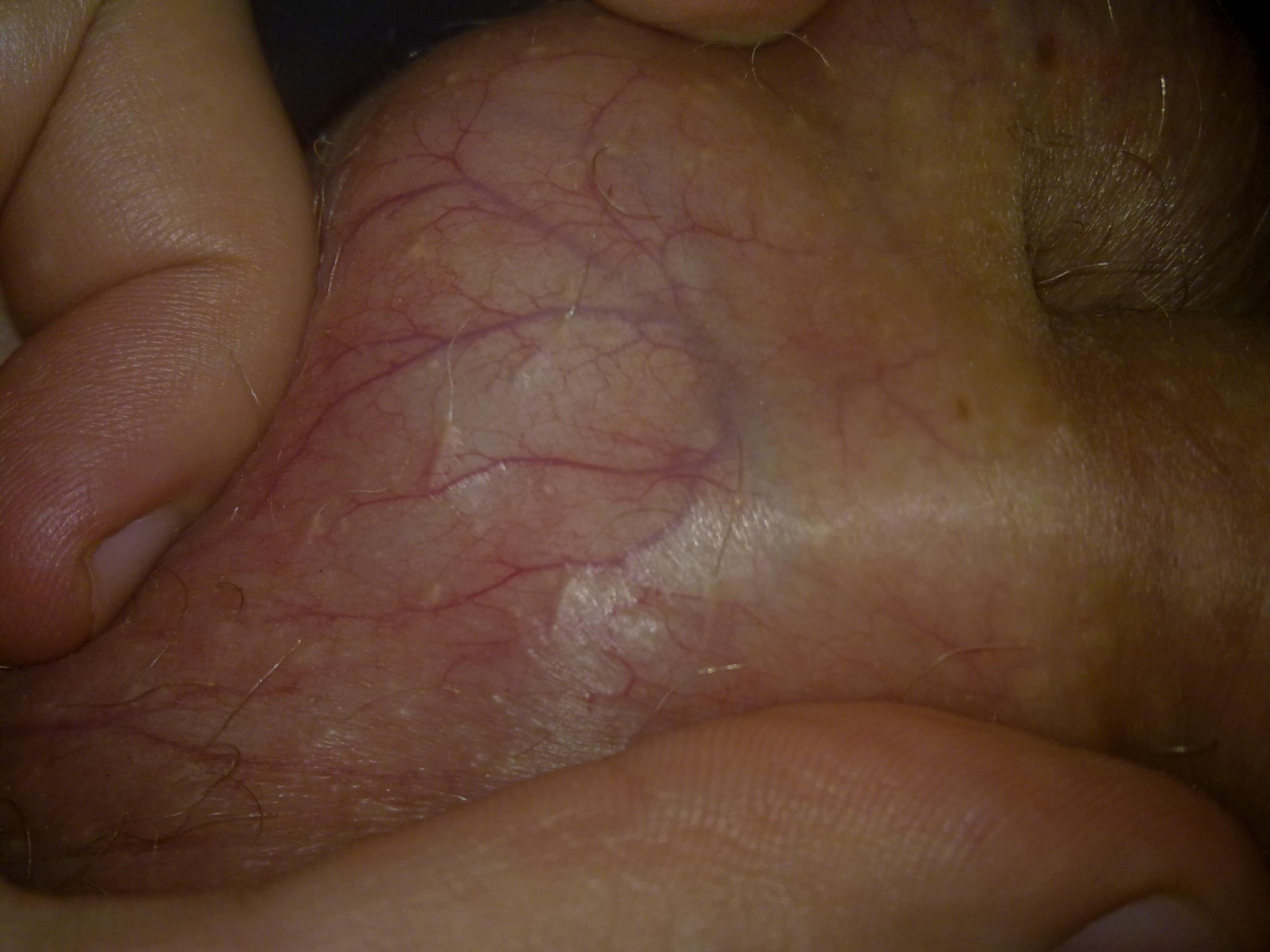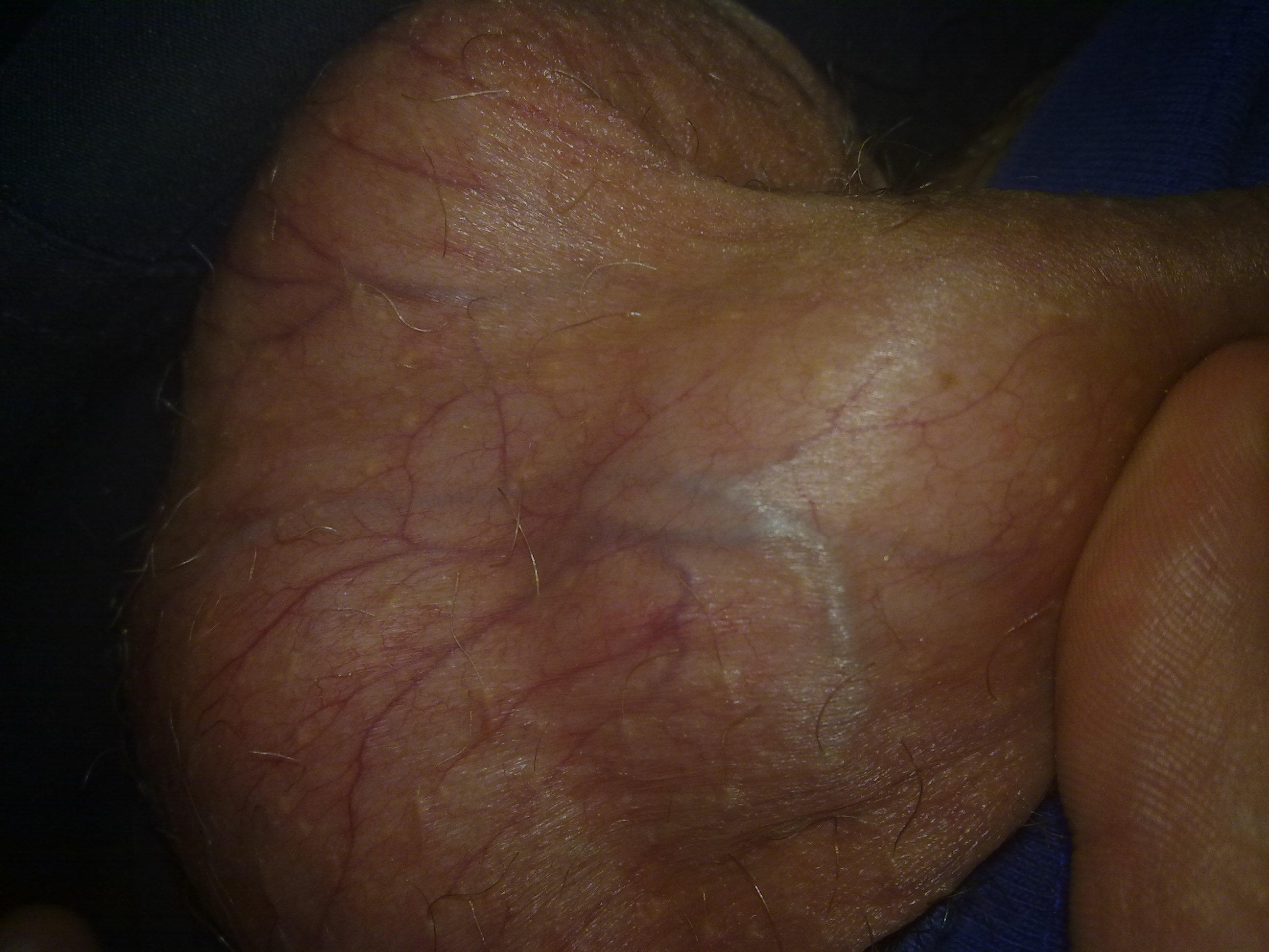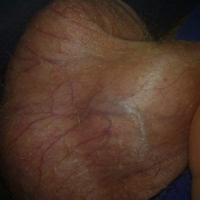 На коже мошонки очень отчётливо видны вены. А так же присутствуют пигментные точки.