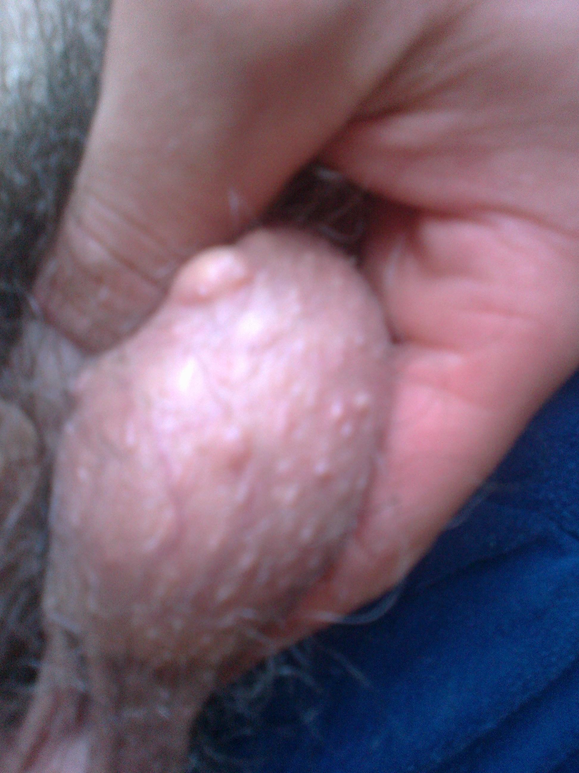 Здравствуйте,у меня на машонке с 15 лет появились белые прыщи,два из них по 5мм остальные маленькие ,они не беспокоят,щас мне 23 венерическими заболеваниями не болел,подскажите что это такое,выложил фото.