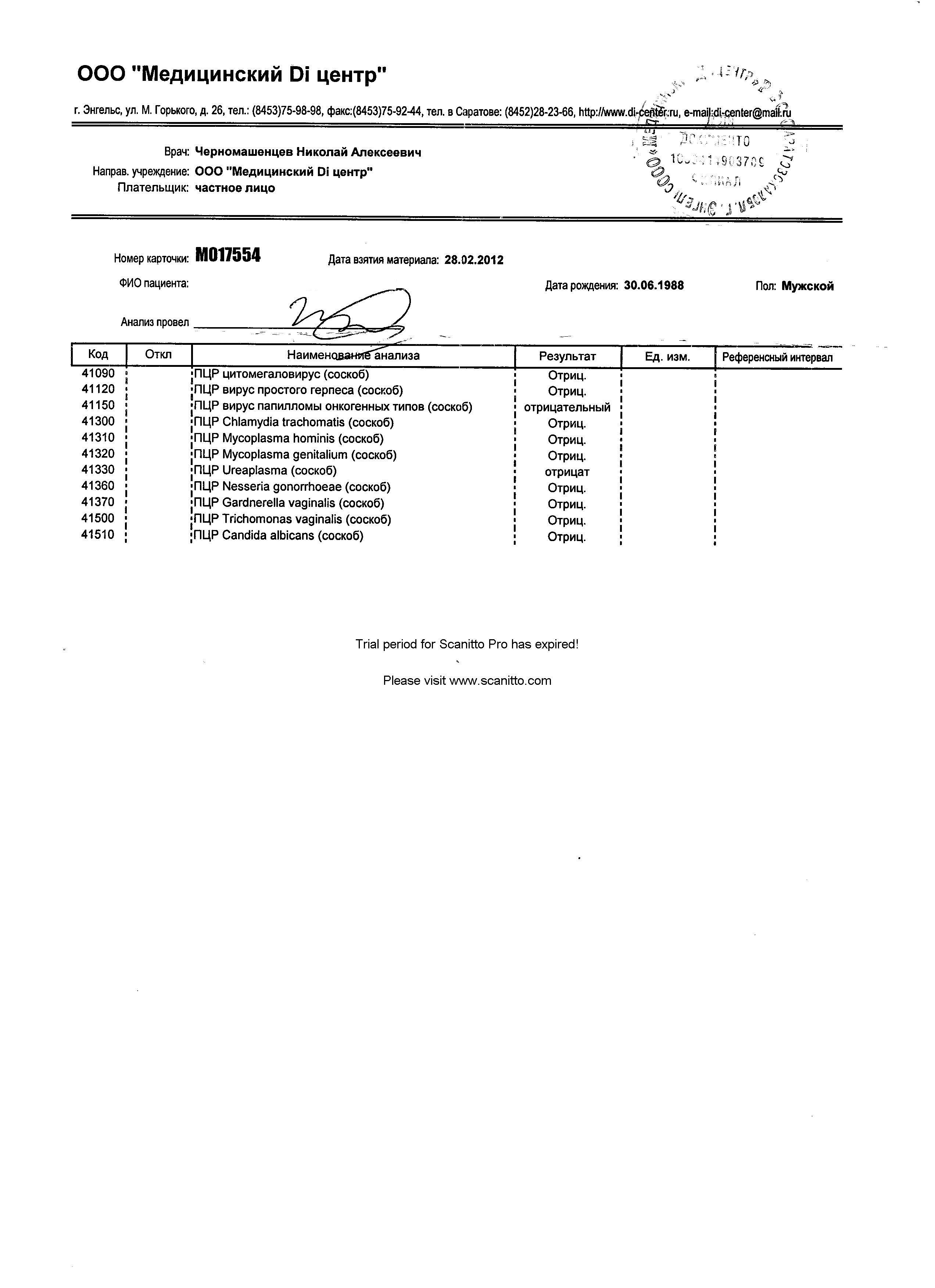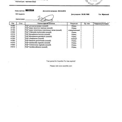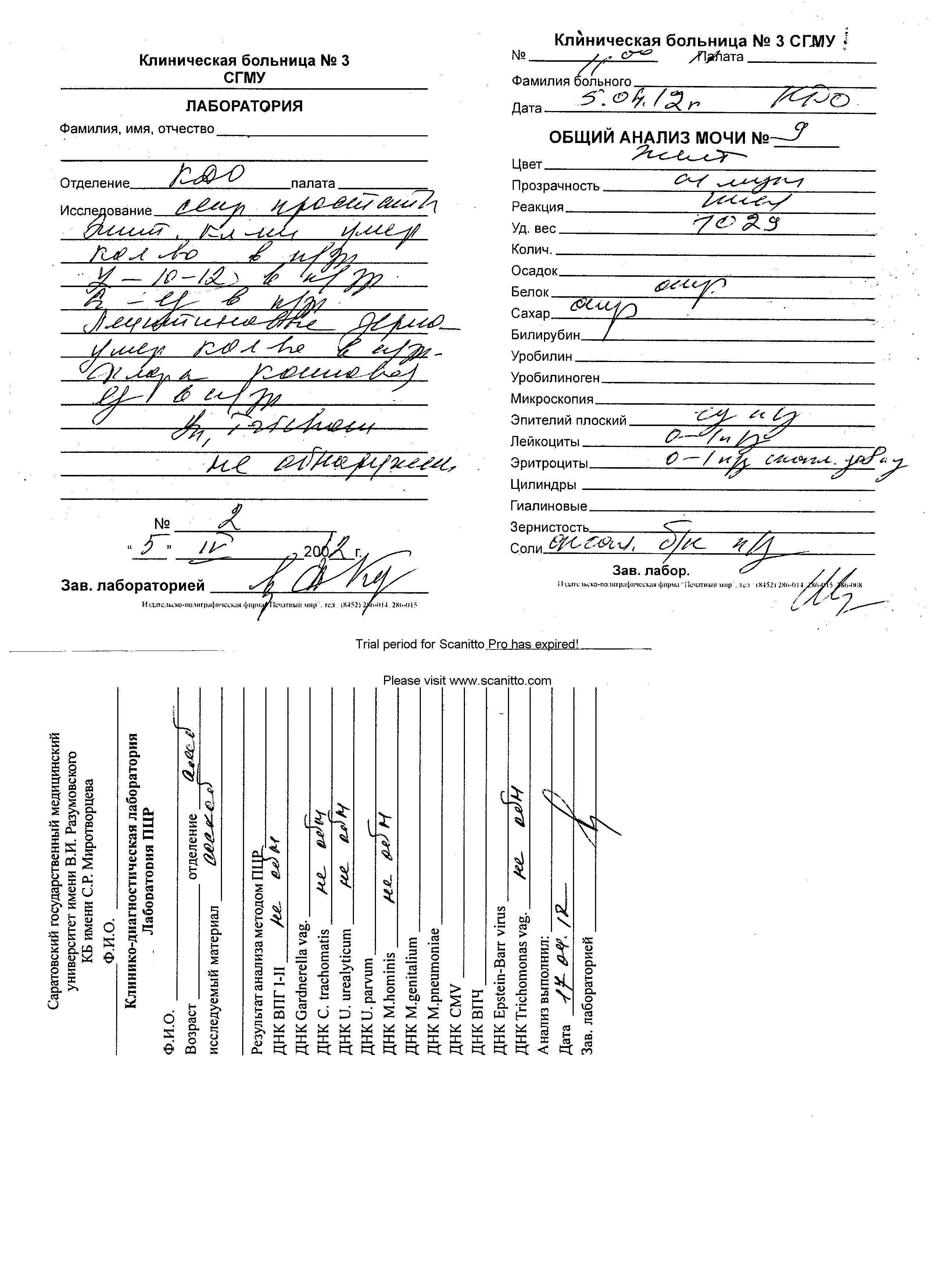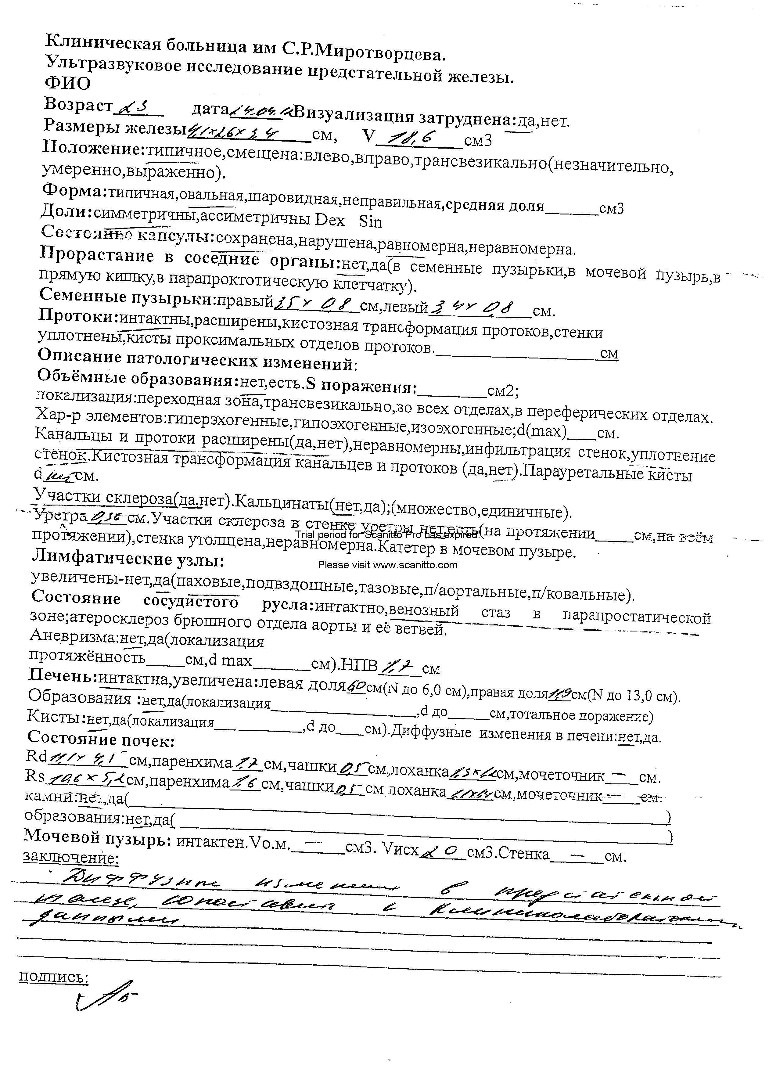 Добрый день! Мне 23 года. Мучаюсь уже три месяца, а дигноз так и не могут поставить. Боль в члене началась в конце февраля, числа 25-26, после незащищенного полового акта. Так же наблюдались красные точки на члене(на головке ничего не было), но они прошли через день. Раньше были такие боли в члене, но лишь после бурного секса и проходили через день. Прождав три дня, боли не прошли, я обратился к урологу в платный центр, который предложил сдать ПЦР, а на время анализа прописал мазь клотримазол. Результаты ПЦР отрицательны, мазь не помогала, при пальцевом осмотре простаты мне поставили диагноз - простатит. Две недели я ходил на процедуры, делали прогревание, массаж простаты, заливали в уретру диоксидин, а дома пил зитролид №6, свечи Кетонал №12, флюкостат и продолжал мазать клотримазолом. Улучшений не наблюдалось и врач прописал мне ещё Флексид и дикловит. Всё безрезультатно. Обратился к другому урологу который направил сдать общий анализ мочи, секрет простаты, УЗИ почек и ТРУЗИ(во вложении сканы результатов) со слов врача результаты нормальные и при пальцевом осмотре сказал что для моего возраста простата нормальная и никакого простатита нет, но выписал пропить: Юнидокс солютаб, свечи Витапрост, Омник, Простанорм, пил 5 дней, надоело, результата не было, бросил. Врач развёл руками, сказал что я здоров и отправил домой. Пошёл к другому врачу, который сказал что я ужё все анализы сдал и больше сдавать просто не чего, но выписал: свечи Биопрост, Троксевазин, уколы Простакор, Лидазу и витамины группы В - всё без результатно, когда пришёл на повторный приём, при пальцевом осмотре мне снова поставили диагноз - простатит, застои и назначил массажи, микроклизмы, ещё гору таблеток. Я не стал дальше продолжать лечение по этой схеме, т.к. доверяю врачу который не нашёл у меня простатита (всётаки заведующий отделения)подумал что из меня снова выкачивают деньги за массажи и приёмы, обратился к другому урологу который предложил сдать кровь на ГСПГ, Дигидротестостерон, Свободный тестостерон, Тестостерон, так же этот врач при осмотре сказал что размеры простаты в норме но консестенция не однородная. Сейчас жду результатов анализа крови и продолжаю мучаться от боли в члене и частых позывов к мочеиспусканию. По началу не было частых позывов к мочеиспусканию, начались они где то через месяц т.е. к концу марта. Все врачи в один голос говорят мне о том что эта проблема от нерегулярной половой жизни. Могу конечно с ними по этому поводу согласиться т.к. половые акты у меня совершались раз в месяц. до этого до ноября 11 года у меня была регулярная половая жизнь (раз в два-три дня на протяжении трёх лет). Боль в члене тянущая и такое ощущение как будто там всё опухло и видимо от самого ощущения дискомфорта мне хочется мочиться. Иногда наблюдаются покраснения на головке. Морально я уже убит, качество жизни ухудшилось до безобразия, находиться на работе и сконцентрироваться на ней я не могу, я не знаю как мне выбраться из этой ситуации, а тянущая боль выматывает, боюсь осложнений, хотя куда ещё хуже... Я уже просто забыл каково это чувствовать себя здоровым, помогите советом, что ещё можно сдать и как добиться адекватного диагноза.