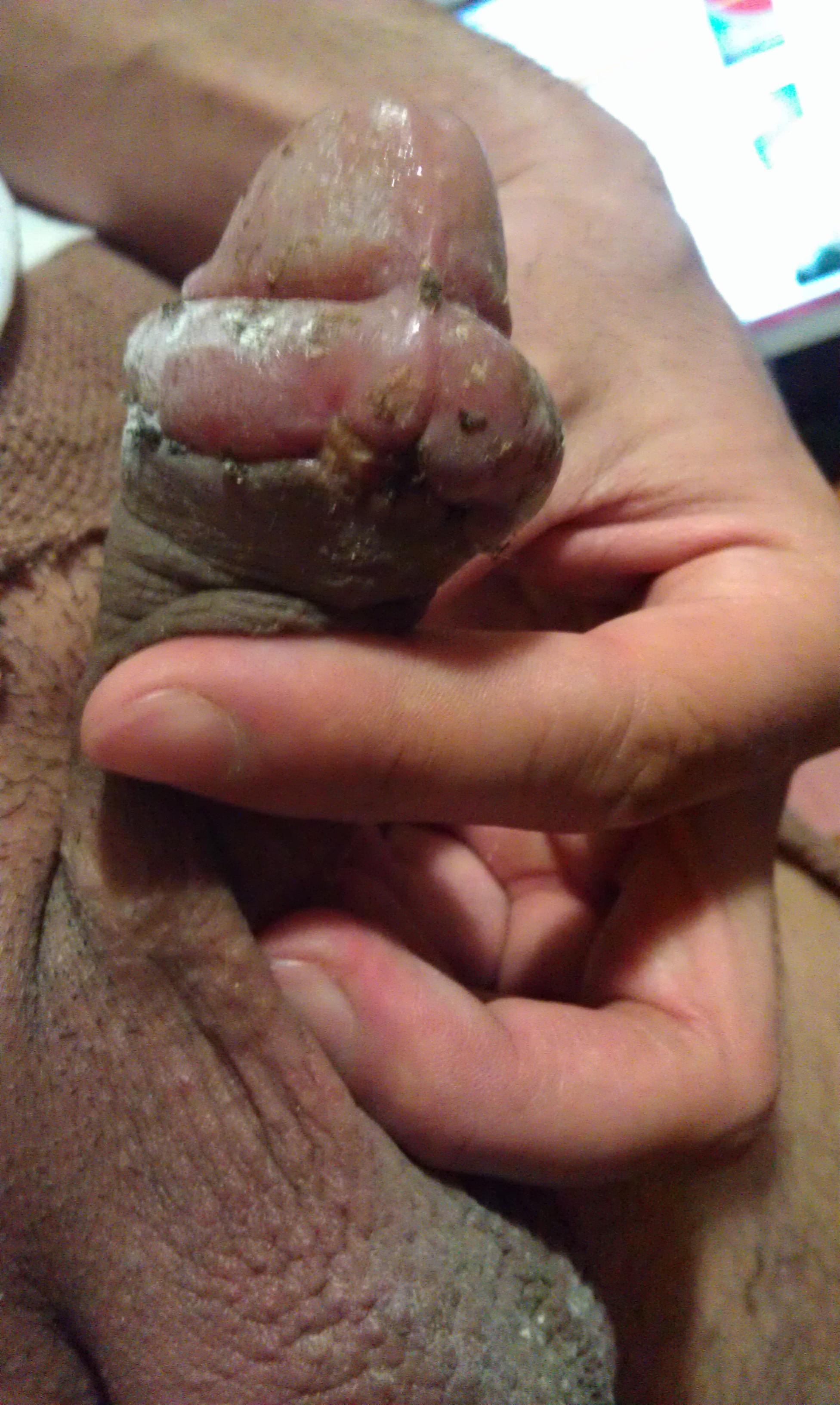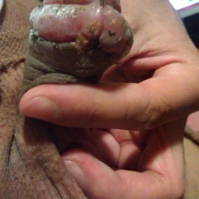 Здраствуйте доктор! Мне 23 года. 15 дней назад сделали обрезание крайней плоти (был фимоз). Теперь у меня вокруг головки отек (который все еще не прошел). Не обращайте внимание. Половой член так выглядит изза порошка банеоцин, и следы маргонцовки. Ниже фото.
