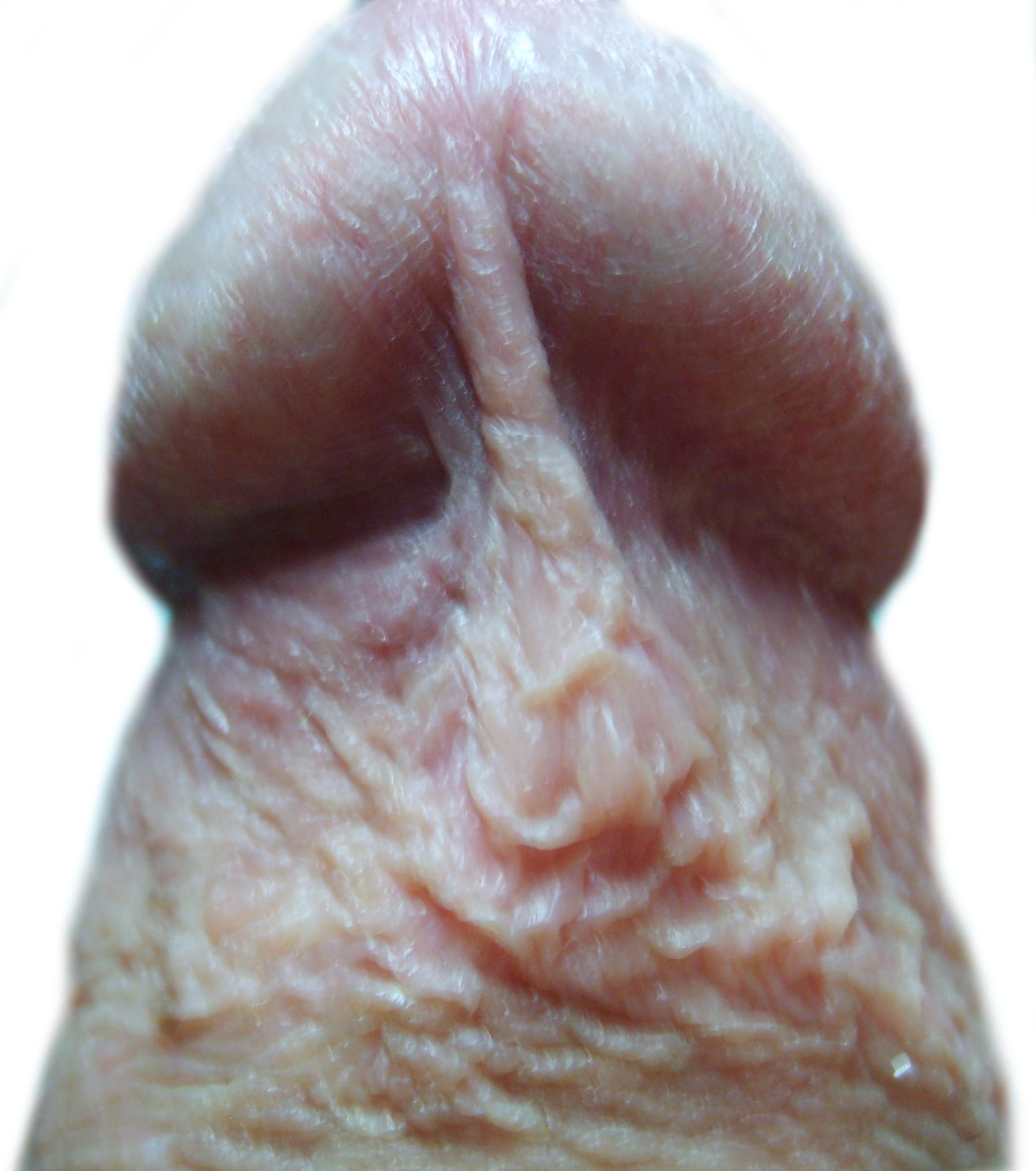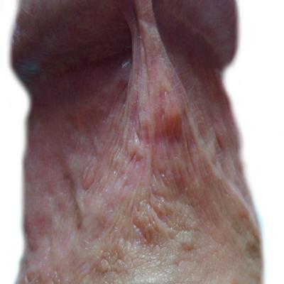 Происходит такое, думаю, потому что место шва и уздечка не однородна в плане кожи. То есть есть узенькие рубцы длиной около 1 см, которые естественно имеют меньшую эластичность (а может это что-то другое).