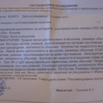 Недавно у меня опять заболело (сильнее чем обычно) и я решил сходить к врачу узнать мол вдруг это все водянка и надо делать операцию. Врач пощупал - мне естественно это все больно, сказал что это не из-за водянки, что у меня воспаление! Даже написал Орхоэпидидимит! Первый раз мне такой диагноз поставили, хотя яичко в таком состоянии уже 3 года!