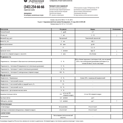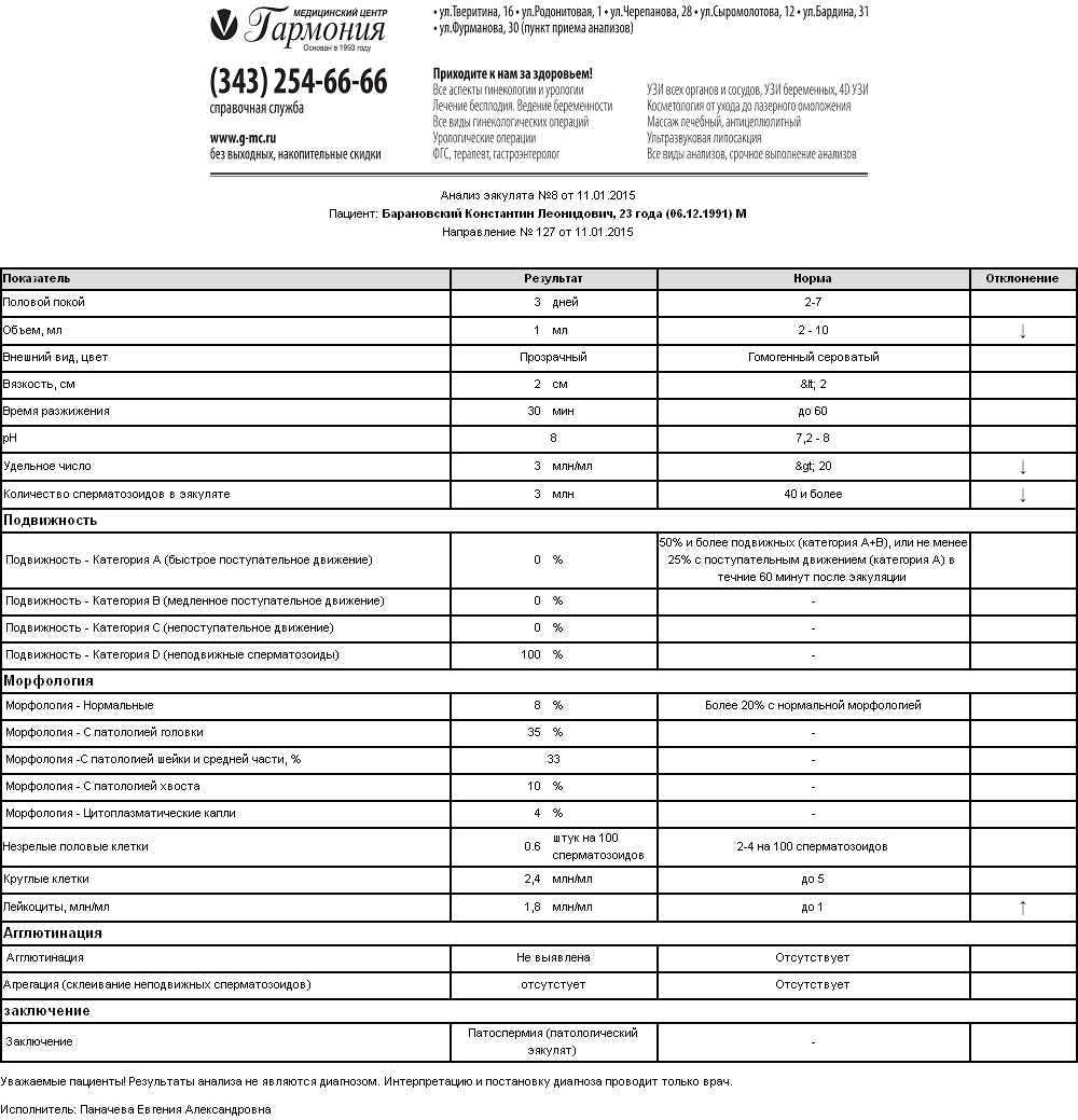 Здраствуйте, можете ли вы расшифровать спермограмму. Мой сын встречается с девушкой, уже практически два года не предохранялись и не беременели. Неожиданно она забеременела. Закралось сомнение сделали спермограммы получили результат. По результату поставили заключение патоспермия(патологический эякулят). Врач же посмотрев спермограмму поставил хронический бактериальный простатит 4 категории,неясной активности.Астенотератоолиголейкозооспермия. Рекомендовал: дообследование ТРУЗИ простаты,м/с. посев, ПЦР на ЗППП секрета простаты, уровень тестостерона крови,урофлоуметрия. Где правда? И возможно такое что ребенок сына?