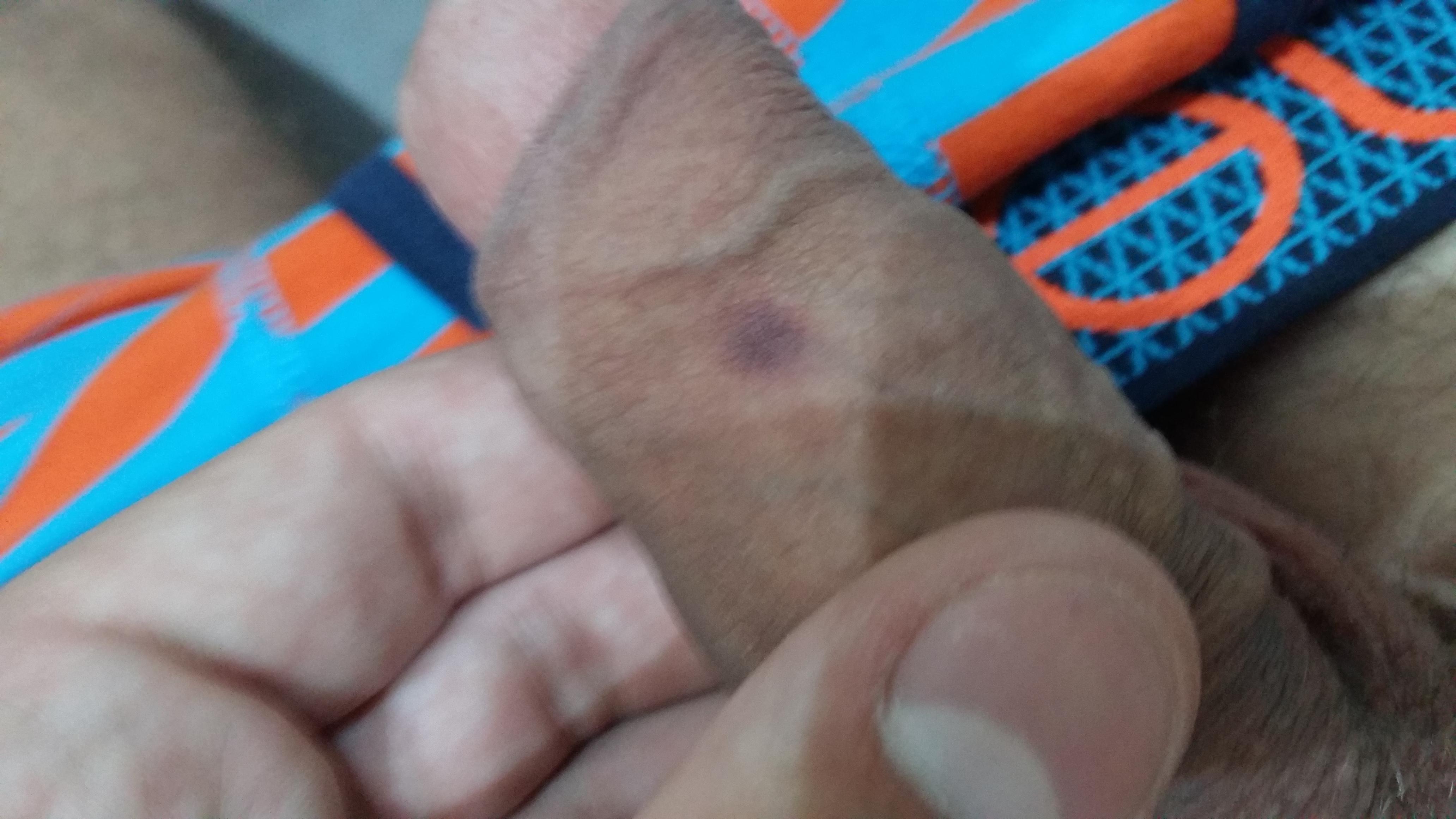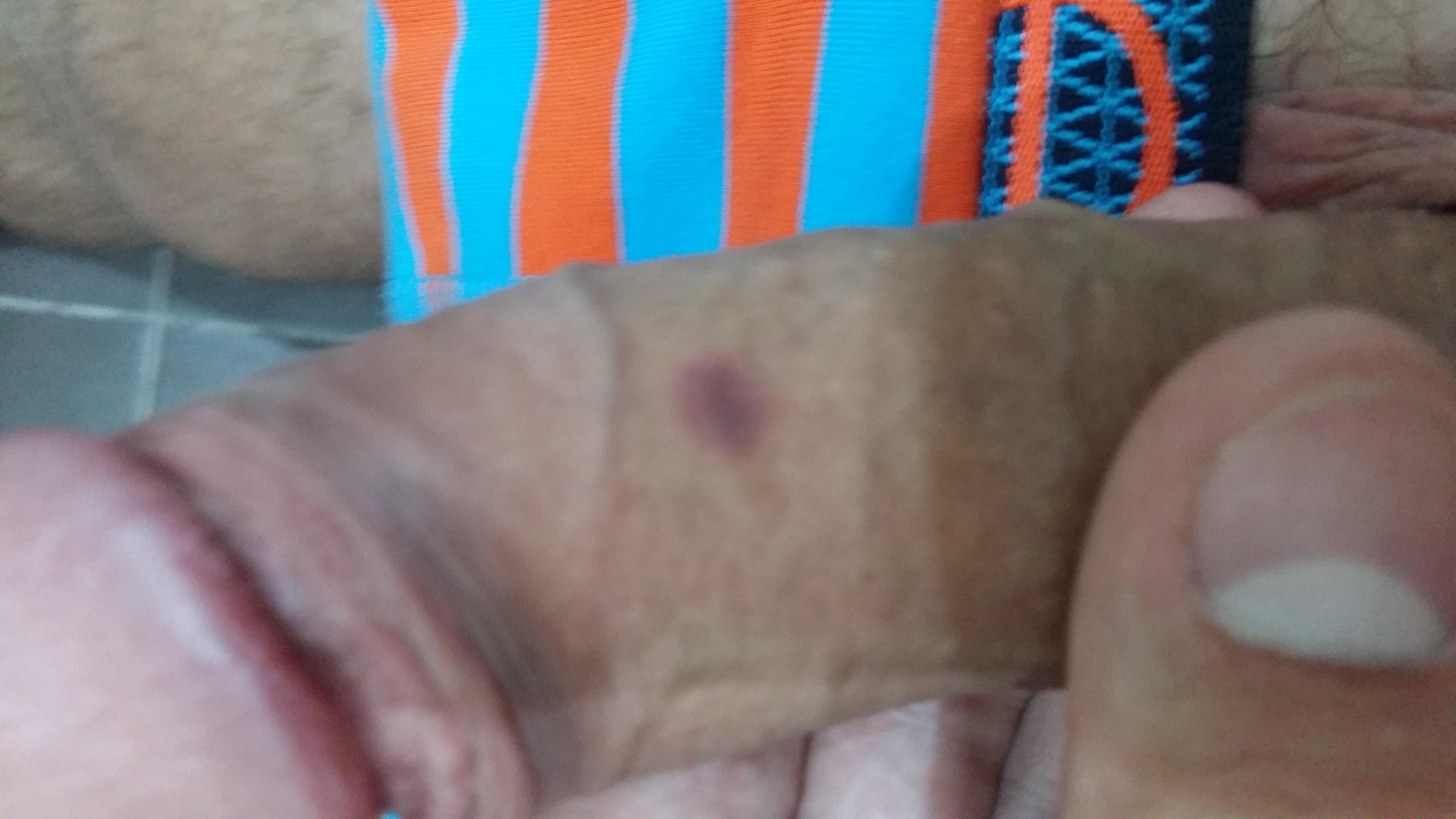 Добрый день , помогите мне разобраться , сразу после секса с девушкой у меня появилось темно-красное пятно на стволе полового органа с правой стороны. Не болит не беспокоит Подскажите пожалуйста что это? Синяк или что то серьезнее? Фото прилагаю. Спасибо