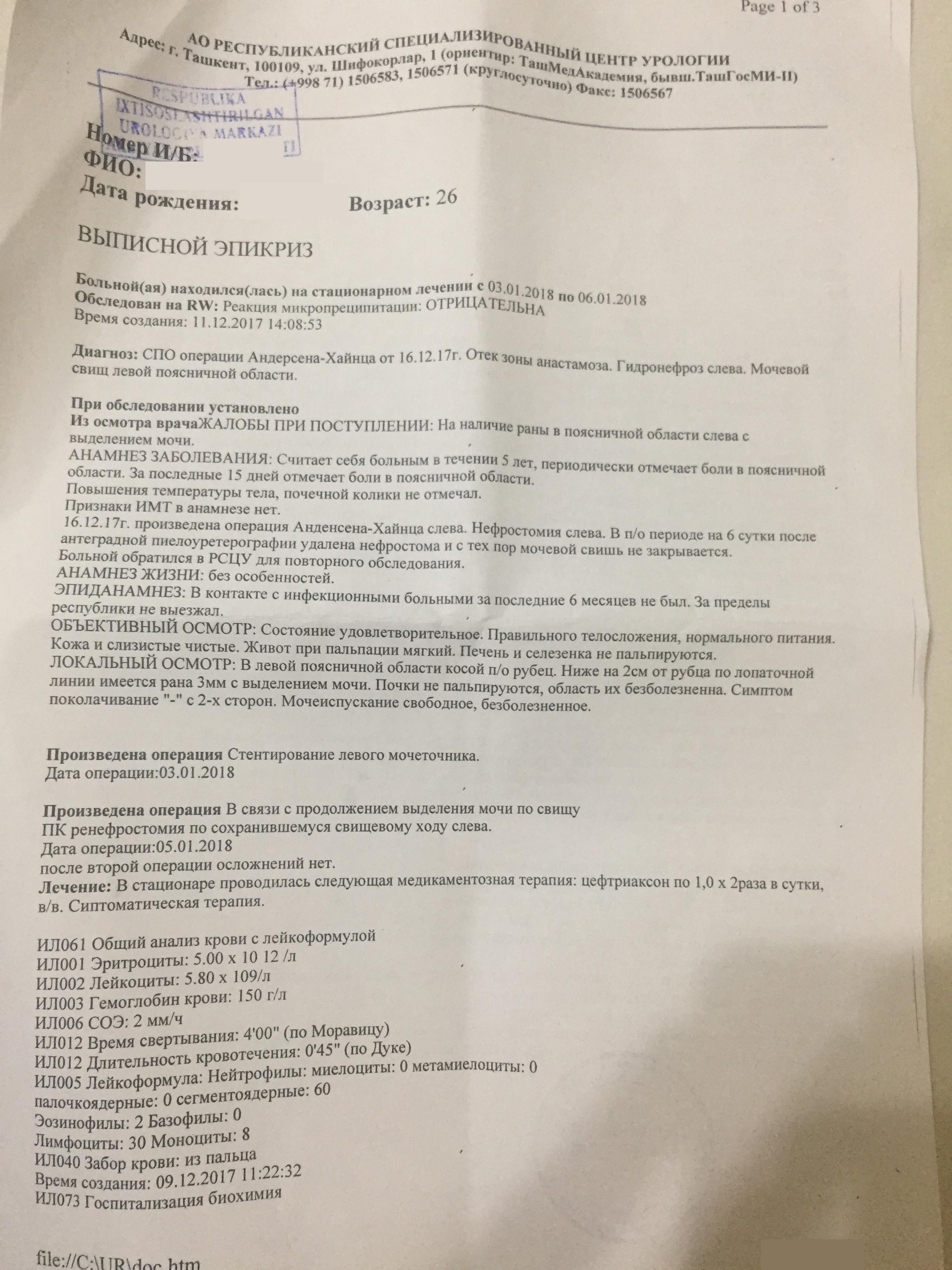 Перенёс 3 операции. Свищ не заживает. Моча выходит со свища. Ставили стент не тянет. Все подробно в приложенном фото.