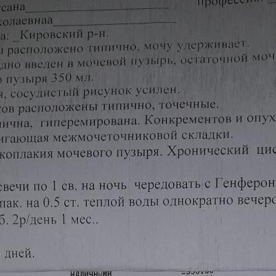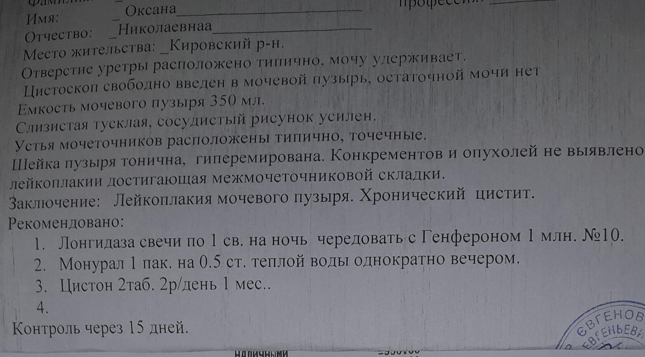 В начале июля начала оущать дискомфорт в низу живота (рези, покалывания, жжение), боли в области поясницы, болевых ощущений при посещении туалета не было и сейчас нет, с частотой мочеиспускаия все нормально. 18. 07 на приеме у Уролога был поставлен диагноз хронический цистит и лейкоплакия мочевого пузыря, был сдан анализ мочи, сделали УЗИ почек и мочевого, а так же цистоскопию (результаты прикладываю во вложенных файлах). При цистоскопии врач сказал и показал что есть небольшой снежок, обратил внимание что в области шейки немного краснова-то, после чего сделал назначение. После первого этапа лечения (Монурал однократно+ректально свечи Лонгидаза и Генферон+Цистон) у меня нет никаких улучшений, дискомфорт остался, разве что не так ярко выражен как при первичном обращении к врачу. Дополнительно был назначен процисталь (пью уже 7 дн. ) + сделали два укола в внизу живота в область мочевого 10. 08 и 15. 08 (Траумель+Мукоза композитум+Солидаго композитум+Лонгидаза), по питанию соблюдаю диету, стараюсь пить много жидкости, пью травяные чаи, однако улучшения не наступают. Дополнительно прошла обследование у гениколога сдала мазки, все в норме, инфекций не обнаружено. Прошу, помогите понять что происходит с моим мочевым, почему не наступают улучшения до полного выздоровления, нужно ли при таком диагнозе принимать антибиотик, необходимо ли предохраняться при ПА?