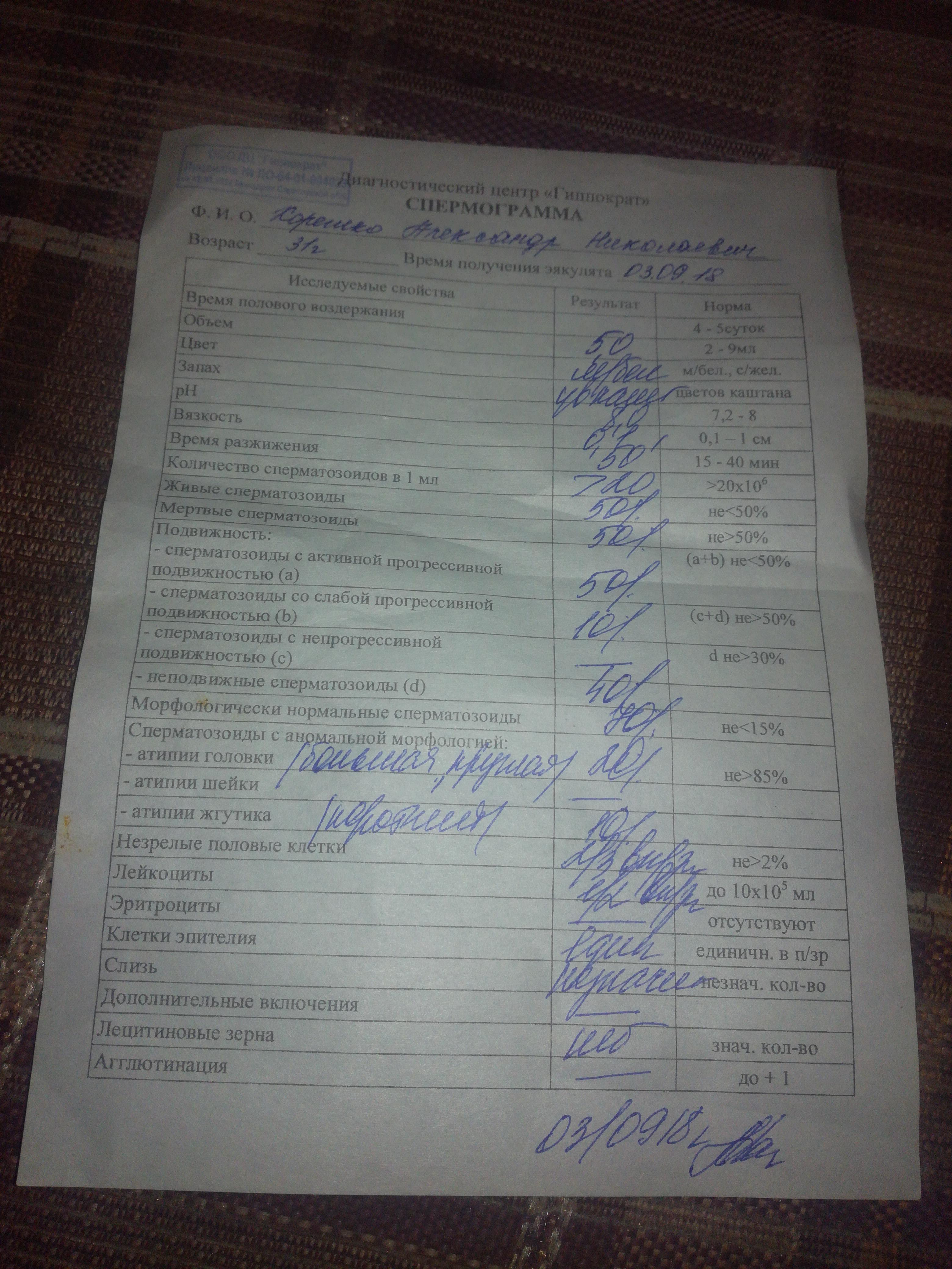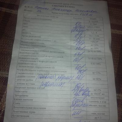 Здравствуйте,я делал сегодня спермограмму,у меня вопрос,у меня нормальные показатели? живые 50 %,мертвые 50%.Из них подвижные 50%,малоподвижные 10%,неподвижные 40%. Морфологически норммальные 70%,аномальные 30%