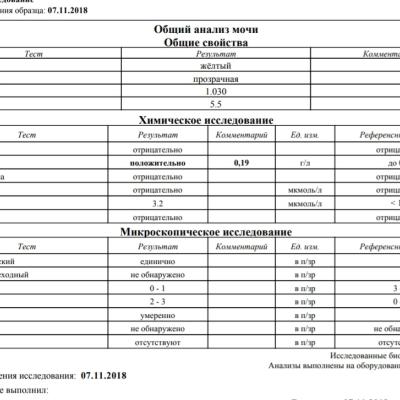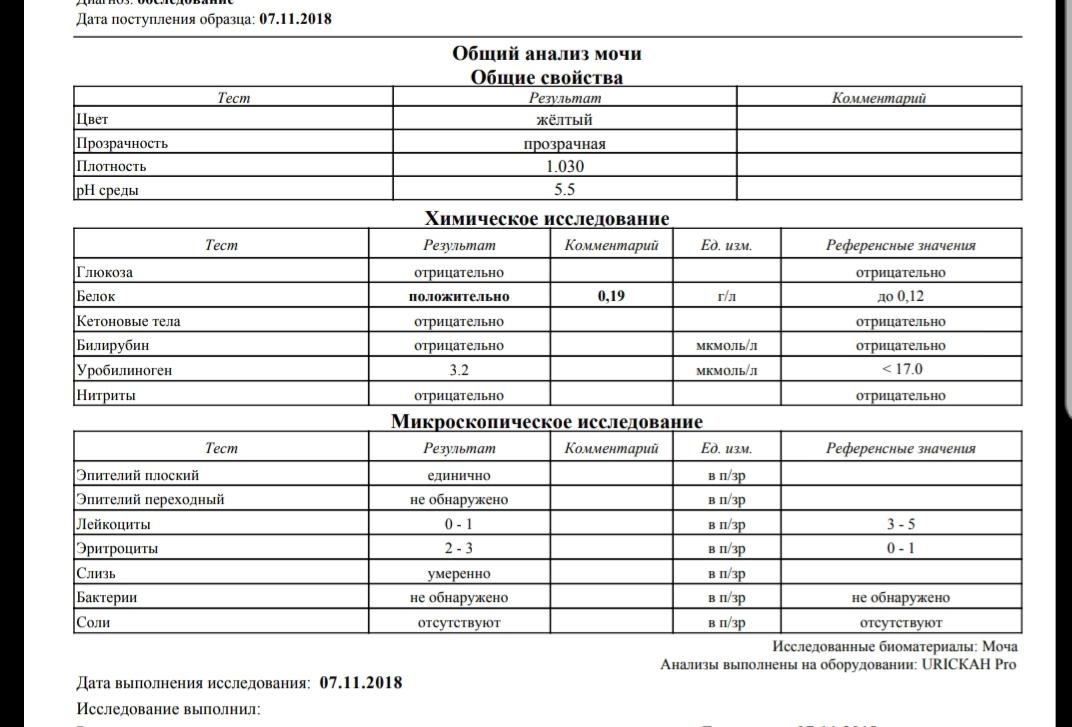 ОАМ - белок 0,19 (норма до 0,12), эритроциты 2-3 (норма 1-2).