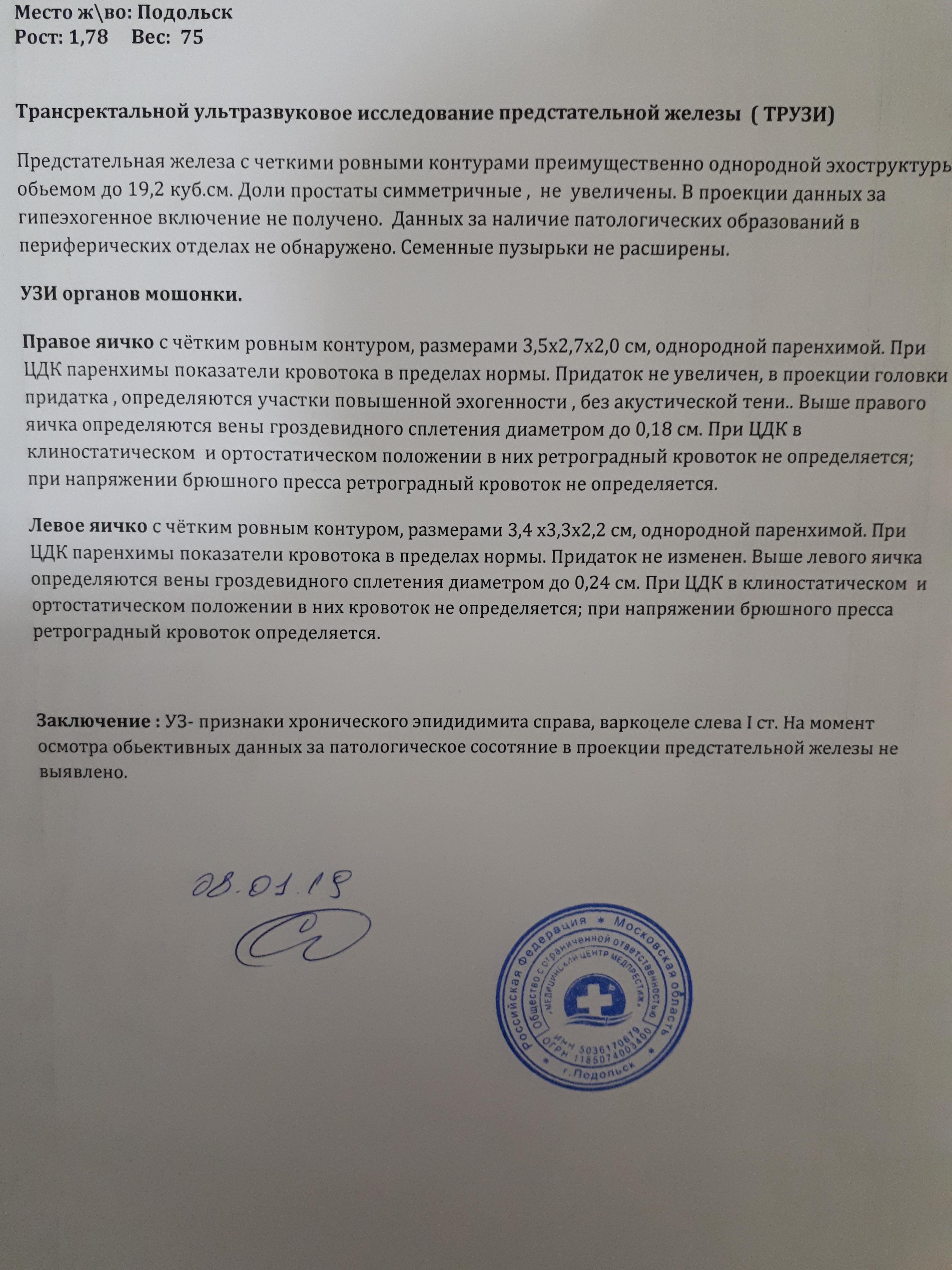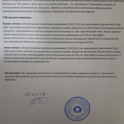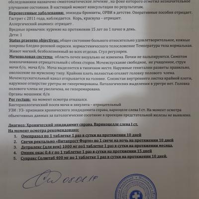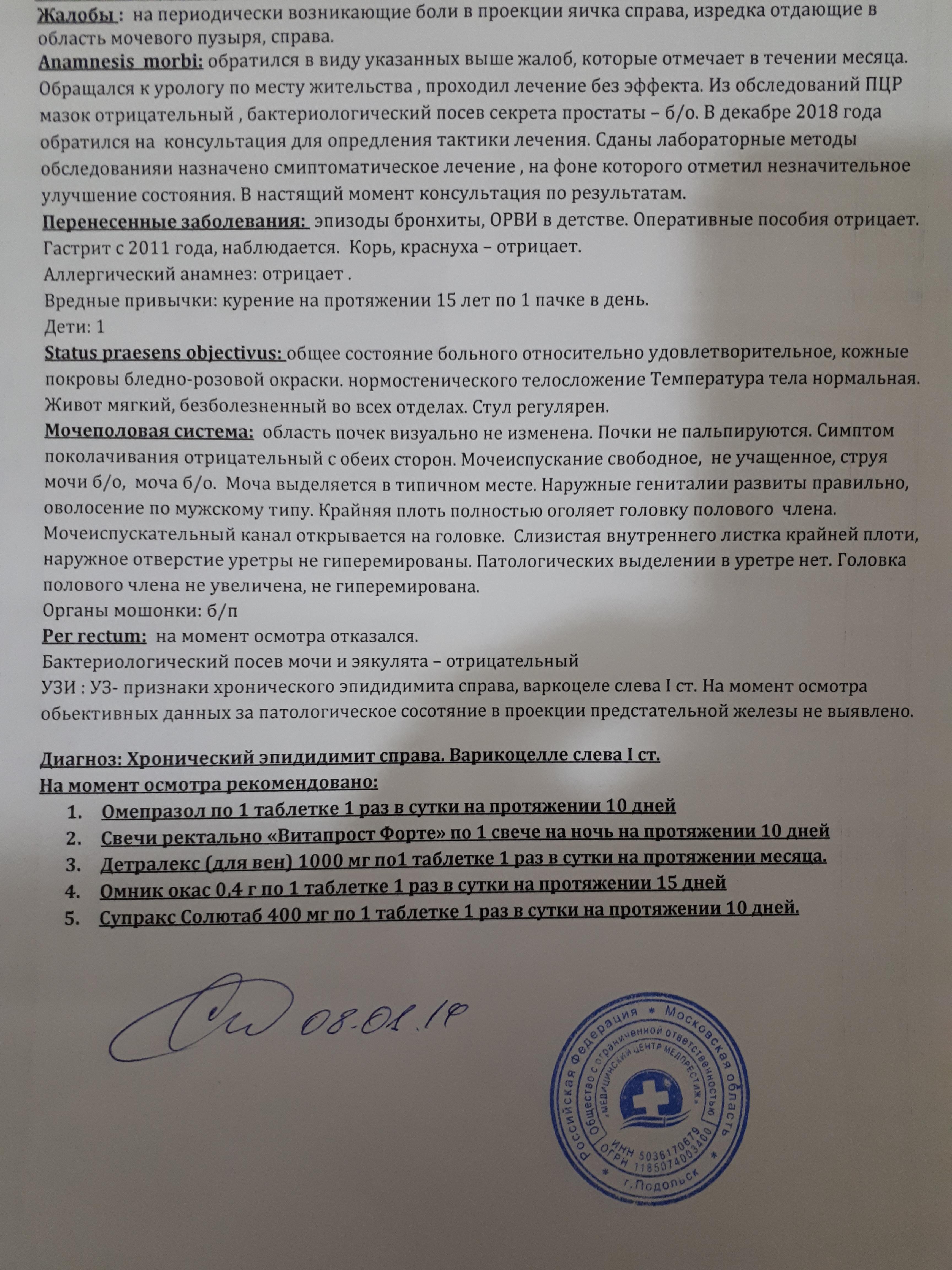 Здравствуйте ! месяц назад почувствовал резкую боль в правом боку, было подозрение на аппендицит (не подтвердилось) вместе с этой болью заболело правое яичко. Обратился к врачу сделал обследование пролечился не помогло боли остались. Обратился к другому урологу, он провел обследование назначил лечение. Вопрос правильный ли диагноз и назначенное лечение? (все обследования на фото)