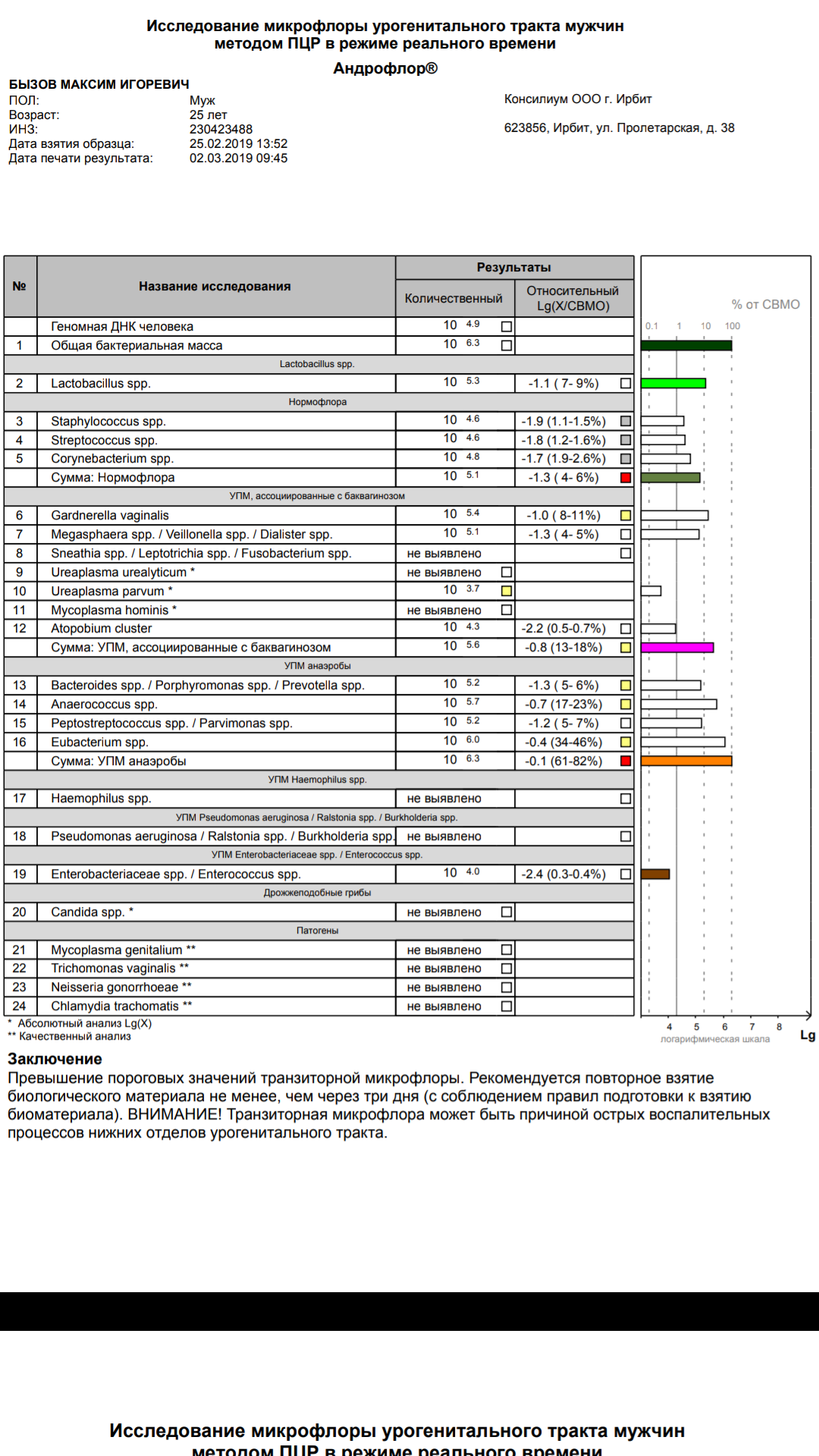 Здравствуйте, лечил энтерококк фекалис и стафилококк гемолитический были 10^6 до этого , потом сдавал посев было 10^3 сейчас сдал андрофлор, пришел результат, но я не понимаю что дальше делать .. лечить уреаплазма первум? И гарднереллу ?