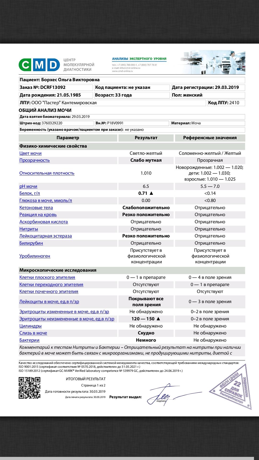 Вчера, в пятницу стало хуже. В какой-то момент начались неприятные ощущения внизу живота и неприятные ощущения в паху, отдающие ломотой даже в ноги. Полежала с грелкой и жизнь как будто наладилась. Назойливые, но фальшивые позывы к мочеиспусканию уже казались мелочью. Муж отнес мочу на анализ (прилагаю результат). Ближе к вечеру стали возвращаться болезненные ощущения и подниматься температура. Выпила фитолизин и через какое-то время фурамаг, потому что легче не становилось. Вернула грелку. Температура поднялась до 38.3. Ближе к ночи стало намного лучше, температура спала. Но сильно изменился цвет мочи в сторону коричневого. Сегодня утром (около 8) отправила утреннюю мочу на ещё один анализ. Цвет был получше, но всё равно смахивал на заварку и вместе с мочой в баночке оказалось что-то похожее на сгусток крови. Результаты будут готовы сегодня после трёх, так же записалась сегодня на узи мочевого пузыря и почек. Знаю, что надо бы задать вопрос... понимаю, что самостоятельный приём препаратов без консультации врача - это нехорошо. Но ко врачу смогла записаться только на 2.04. Может, вы можете хотя бы прокомментировать анализ? Сдавался днём, всё, что смогла. И может, я так же могу прислать вам когда будет готово сегодняшний результат и узи?