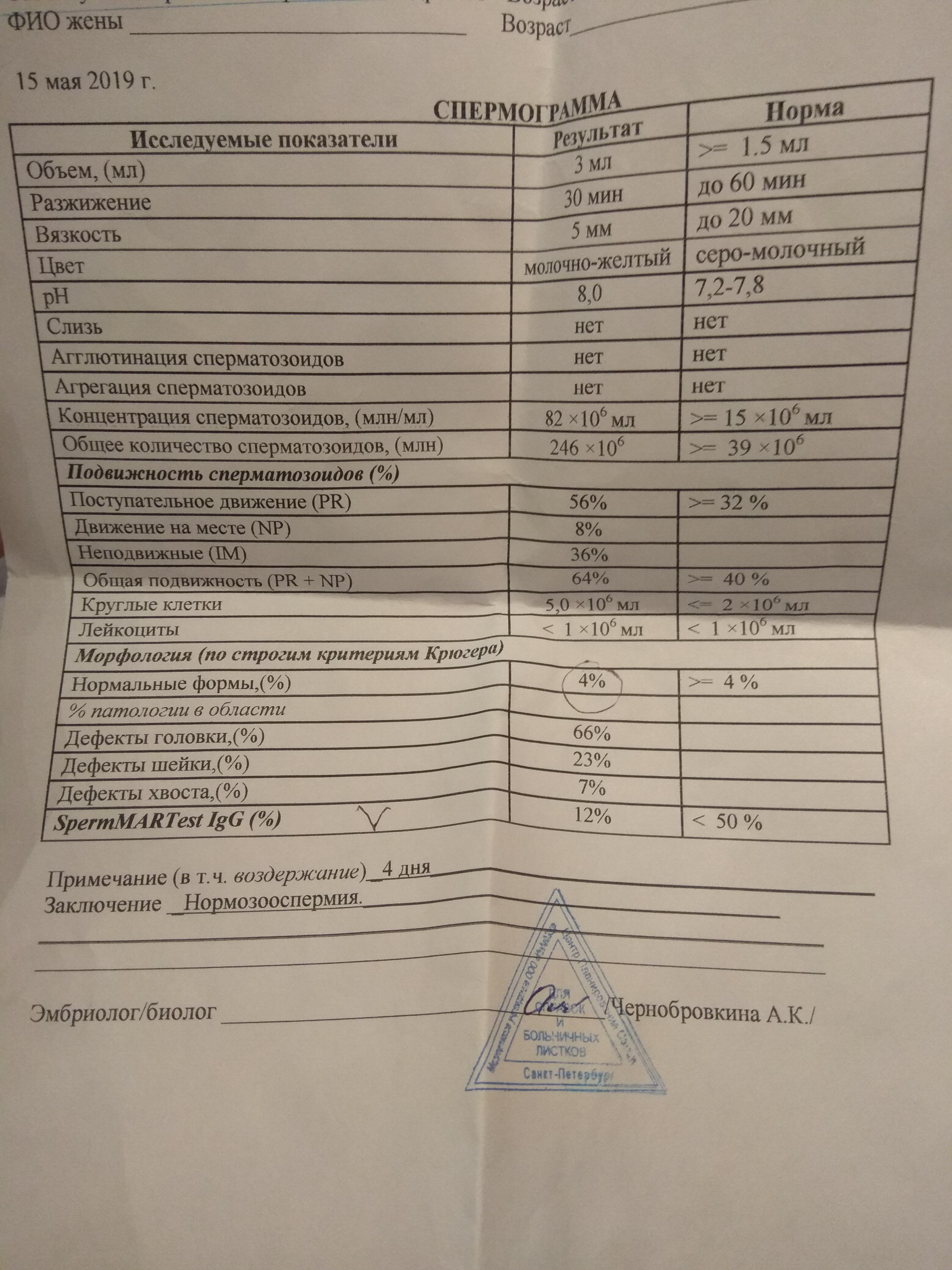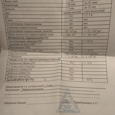 Добрый день! В целом спермограмма неплохая, но нормальные формы -на границе нормы. Могу рекомендовать препарат Мираксант (http://miraxant.ru/). По результатам клинических исследований он положительно влияет на сперму (а именно на подвижность сперматозоидов, увеличивает их количество и качество) и повышает вероятность зачатия. Принимать его нужно в течение 3- 6 месяцев, и сдавать контрольную спермограмму через 3 месяца и через 6 месяцев от начала приема. Такой промежуток связан с тем, что в течение 3 месяцев происходит полное обновление клеточного состава эякулята (спермы). Во время приема препарата можно продолжать попытки забеременеть. Удачи.