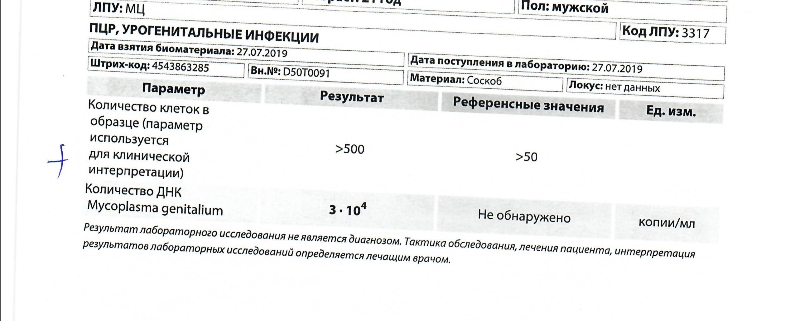 Добрый вечер, я бисексуал и у меня был анальный секс . У моего партнера найдена микоплазма гениталиум. Я сдавал анализ из уретры и получил отрицательный результат. Через пару дней, когда ходил в туалет, то в кале обнаружил светло белые примеси ввиде слизи. Так же есть понос, неприятные ощущения дискомфортные. Сдал недавно анализ на микоплазму гениталиум из ректальной части и получил положительный результат 3*10^4. Если я обращусь к доктору для определения медикоментозной терапии по лечению микоплазмы и не буду сообщать о своих предпочтениях в сексе и откуда был взял соскоб. Сможет ли он мне правильно назначить препараты по лечению? Уберут ли они сиптомы выделений в кале? Посоветуйте медикоментозное лечение, как в моем случае лучше сделать. Спасибо за консультацию