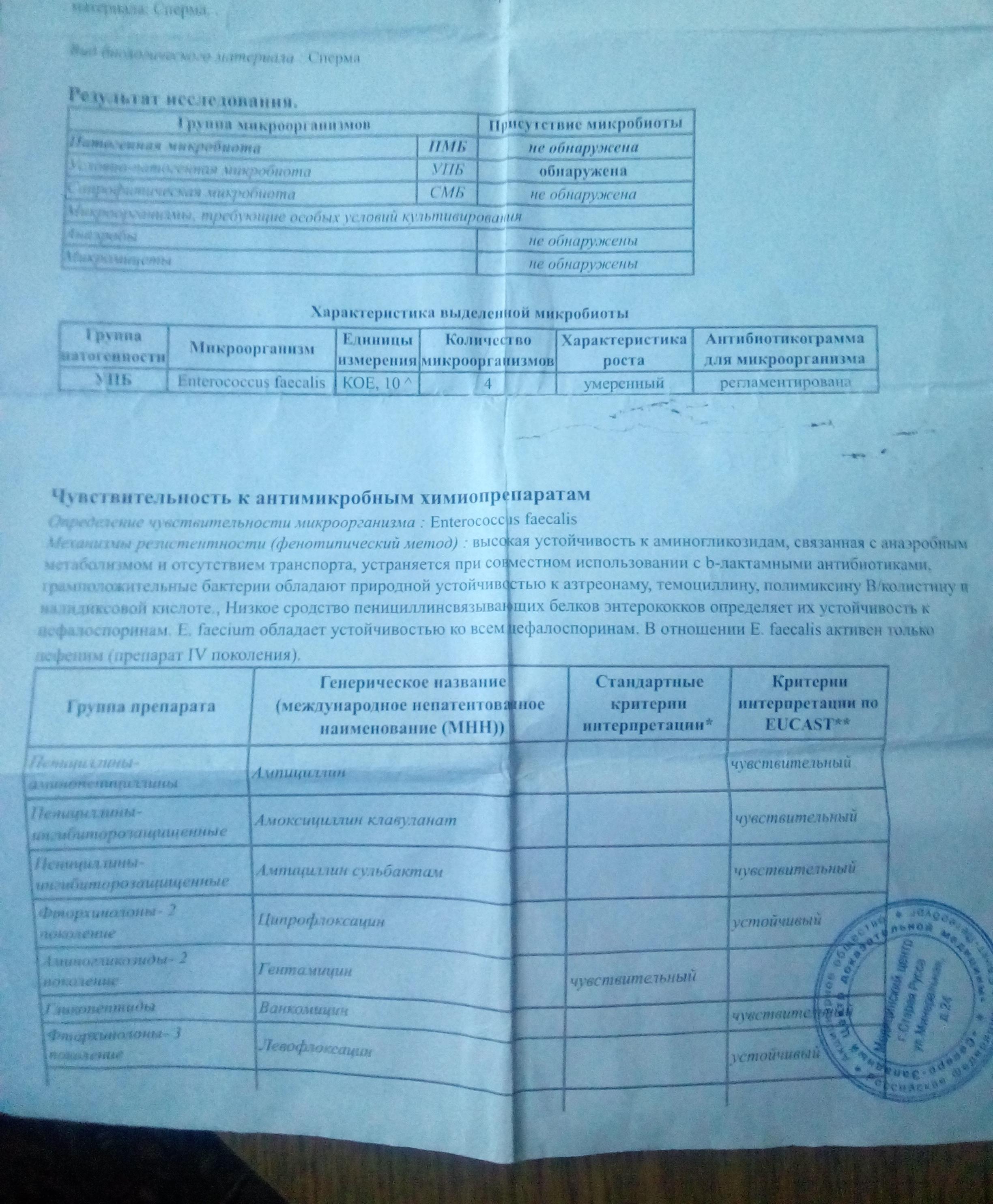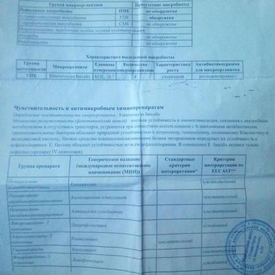 Здравствуйте! Нашли бактерию e.faecalis. 10.4.В лаборатории написано приписать цефепим. Мне назначают левофлоксацин,Амоксиклав,eleflox. Хотя написано что эффективен только цефепим. И так уже год. Анализ посева показывает один и тот же результат. И написано что нужно принимать. Или они не читают до конца или я не знаю. Температуру зьбили, жар тела и пот вечером остался. Колит в промежности. И в низу живота с лева,потенция слабая, при приёме антибиотиков возращаеться.Трузи показала что с простатой всё нормально. Врач взял сок простаты,говорит сильная простуда. И те же таблетки опять. Каждый месяц всё по-новому. Подскажите что делать. Врач от нас в 3 часах езды. Уже надоела кататься.
