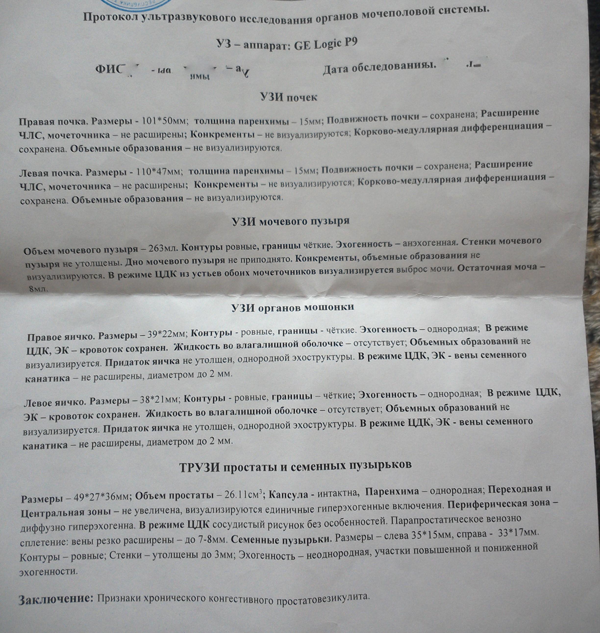 Здравствуйте ! Полгода назад мне поставили диагноз - признаки хронического конгестивного простатовезикулита. Посетил уролога по той причине, что у меня началось подтекание мочи после мочеиспускания. То есть после туалета незаметно моча подтекает в трусы, чего я даже не замечаю. Это у меня происходит не первый год, и не придавал этому значения, даже не подозревая что это может быть связано с простатитом. С школьных лет занимался онанизмом почти каждый день или за два дня один раз, когда именно началось подтекание не вспомню, но уже достаточно давно. Уролог прописал мне Омник (применял 1 месяц), диклофенак (не применял), простакор (уколы) (10 дней делали в поликлинике), цефтриаксон (2 недели), СМТ ( 2 недели, ставили пластины на простату или просто сидя). От диклофенака (свечи) я отказался, так как узнал что применять его при гастрите не рекомендуется. Особых улучшении я не заметил, по крайней мере сейчас все как прежде, подтекает моча по размеру 5 см радиус пятна в трусах (хотя стараюсь максимально опорожняться). Болей я не чувствую, болевых ощущении нет, возможно они настолько малы, что я не замечаю. Подскажите пожалуйста, как мне сейчас быть, какие пить лекарства ? половой жизни у меня нет и не было, с давних времен занимаюсь онанизмом, в данный момент в неделю 2 раза, и стоит ли прекращать это делать вообще или наоборот увеличивать ? уролог посоветовал жить половой жизнью, но у меня в личной жизни все сложно. Ниже выкладываю результаты анализов, сдавал анализ крови, и мочи - все нормально. И я так и не понял, у бактериальный простатит или бактерии не причем ? Буду рад за подробные ответы..