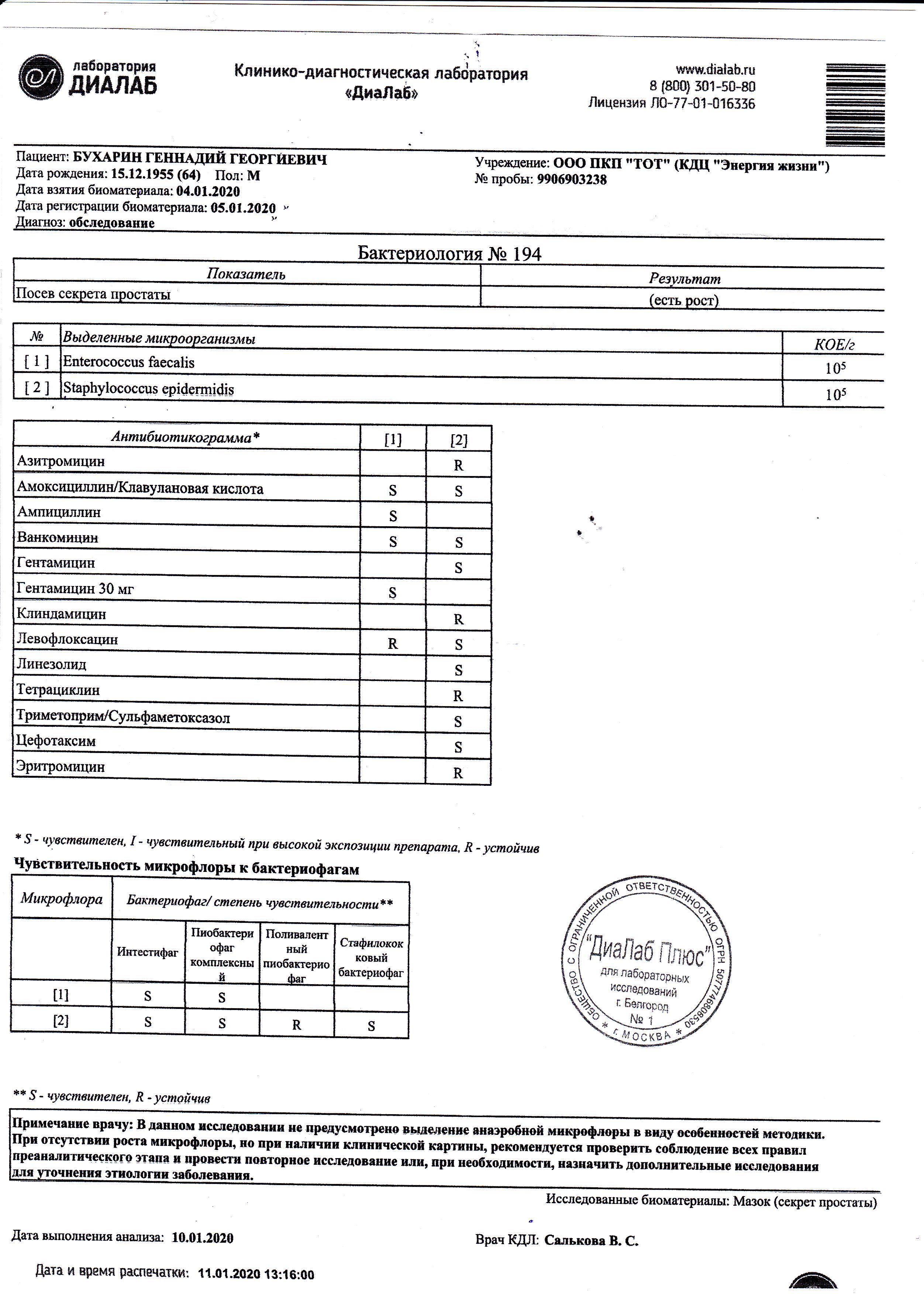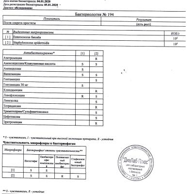 Здравствуйте! По результатам исслеований - имеет место урогенитальный воспалительный процесс. Лечение может наначить лечащий врач с учётом всех исследований( УЗИ, анализа крови на ПСА и др.). По результатам бакпосева логично будет наначить антибиотик, к которому чувствительны оба выделенных микроорганизма. Удачи!