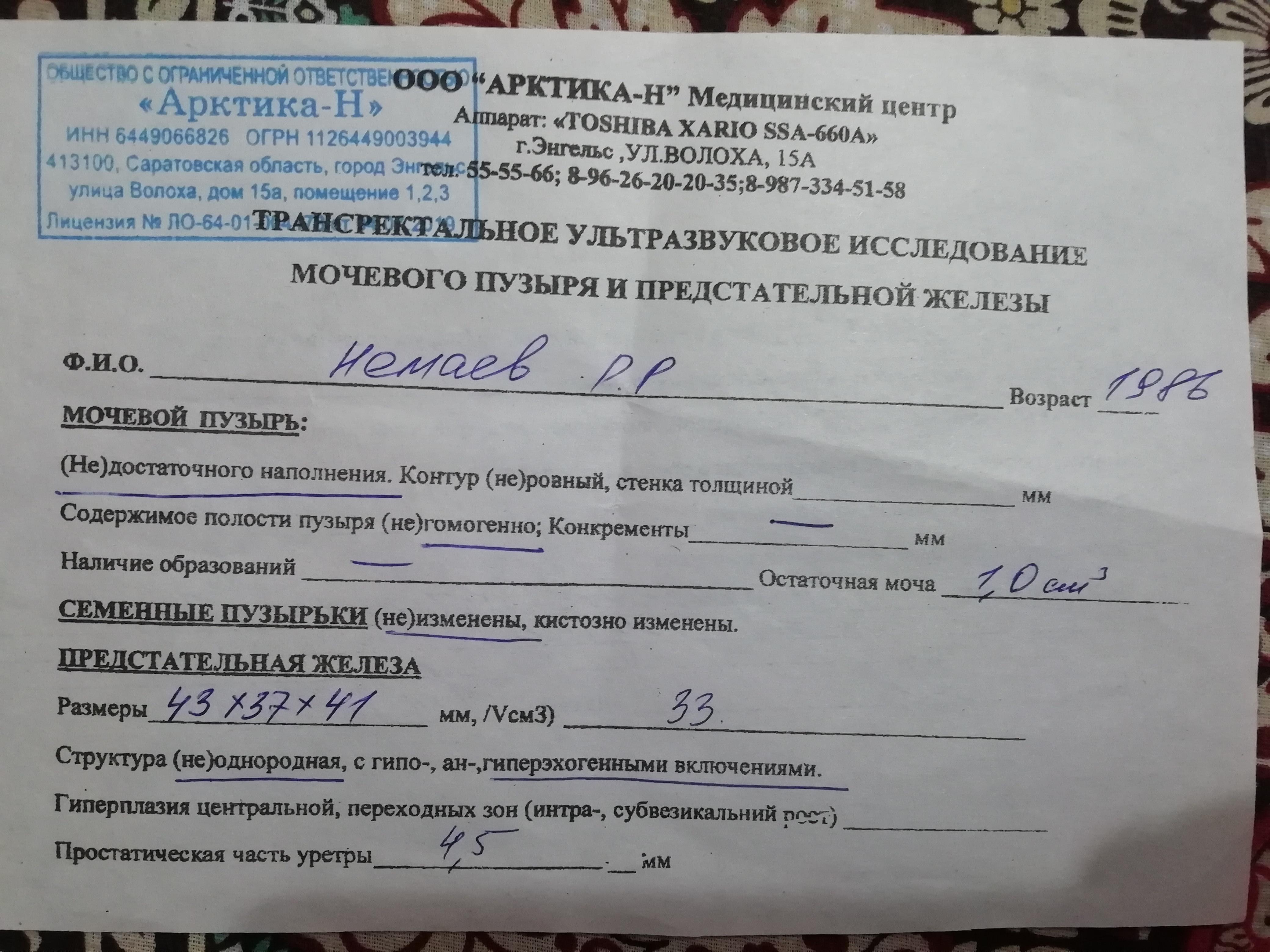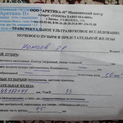 Здравствуйте! Прежде всего, советую переделать УЗИ простаты и сделать ТРУЗИ ПЖ и семенных пузырьков. С результатами покажитесь обязательно урологу очно - необходимо произвести пальцевое ректальное исследование простаты. По результату исследований и осмотра будут выводы.