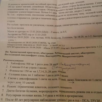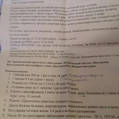 Здравствуйте помогите, осенью ставили застойный прастотита, были лекацыты в соке простаты 18-20,личился месец антибиотики, и свечи, контрольный анализ после норма, в марте начелось жение в уретри, сдал анализы мочи, общий, нечепоренко, сперму, привышен и лейкоциты, в сперме 60,в моче сплош, нечепоренко 48000,назначили опять месец антибиотики, сказали что переохладился, но не где не мерз, может причи на в другом, анализы и заключении и лисение скину, фото, помогите советом, а то уже года 3 переодически антибиотики пью