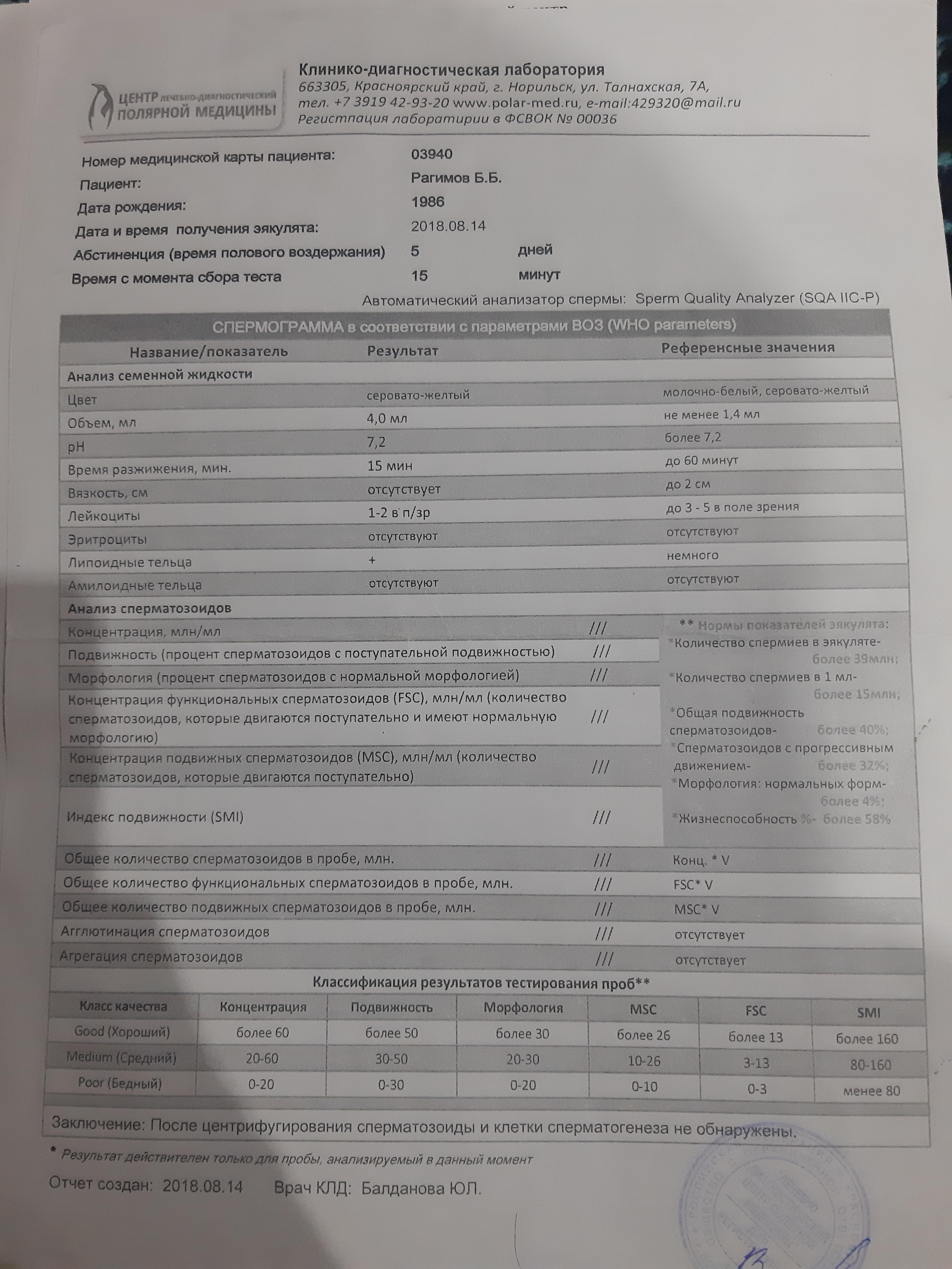 Заключение в спермограмме таков: после центрифугирования сперматозоиды и клетки сперматогенеза не ОБНАРУЖЕНЫ.