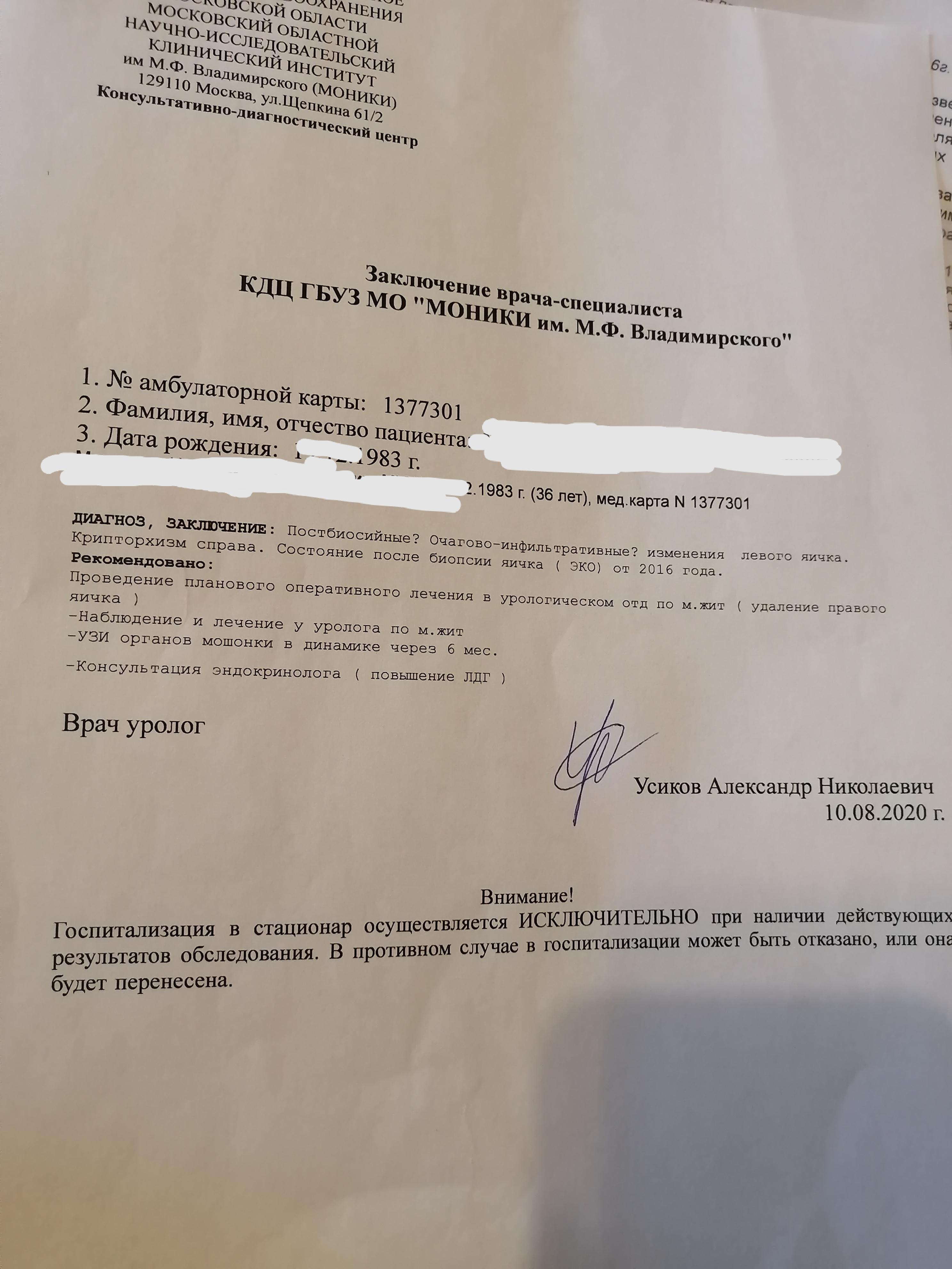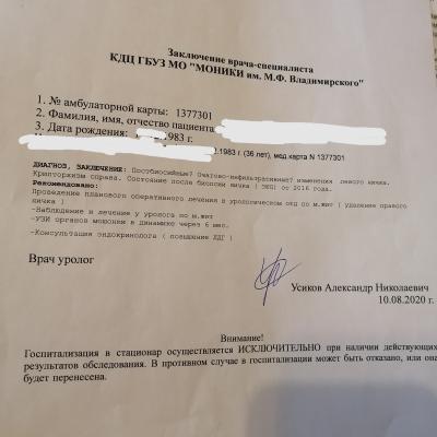 Здравствуйте! У Вас есть рекомендация из МОНИКИ - удаление правого( неопущенного) яичка. Это важно, т.к. в дистопированных яичках повышен риск образования онкопатологии. Из Вашего обращения не ясно, было ли успешным ЭКО и планируете ли Вы повторять попытки ЭКО. Для подготовки к ЭКО можно рекомендовать Мираксант, по согласованию с репродуктологом.