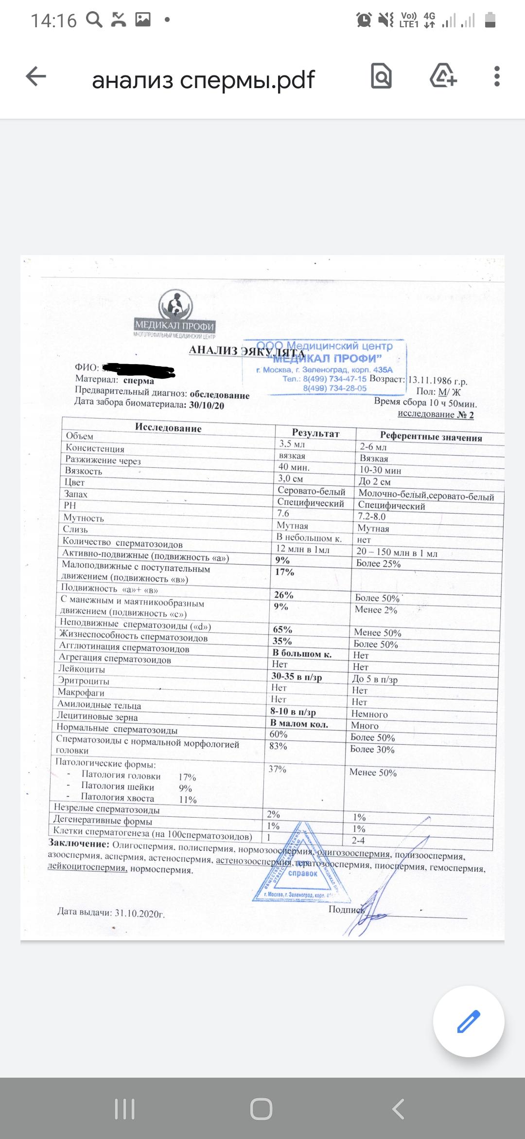 Добрый день!не происходит зачатие,сдал спермограмму,показатели отклоняются от нормы. Какой может быть диагноз,это лечится и как долго?Спасибо.