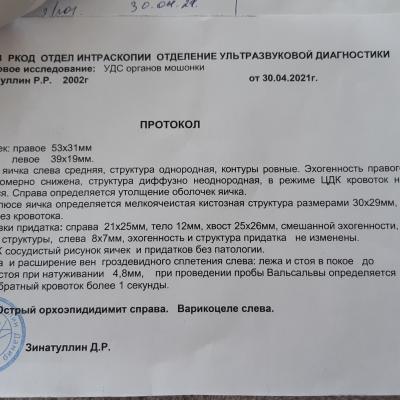 Здравствуйте! В первую очередь - сделайте повторное УЗИ органов мошонки и подвздошных сосудов и лимфоузлов. С результатами - покажитесь лечащему урологу очно, согласуйте с ним тактику дальнейшего обследования и лечения, обсудите целесообразность выполнения анализов крови на – хорионический гонадотропин человека (ХГЧ), альфа – фетопротеин (АФП), лактатдегидрогеназа (ЛДГ). Обязательно очно наблюдайтесь у врача. Удачи!