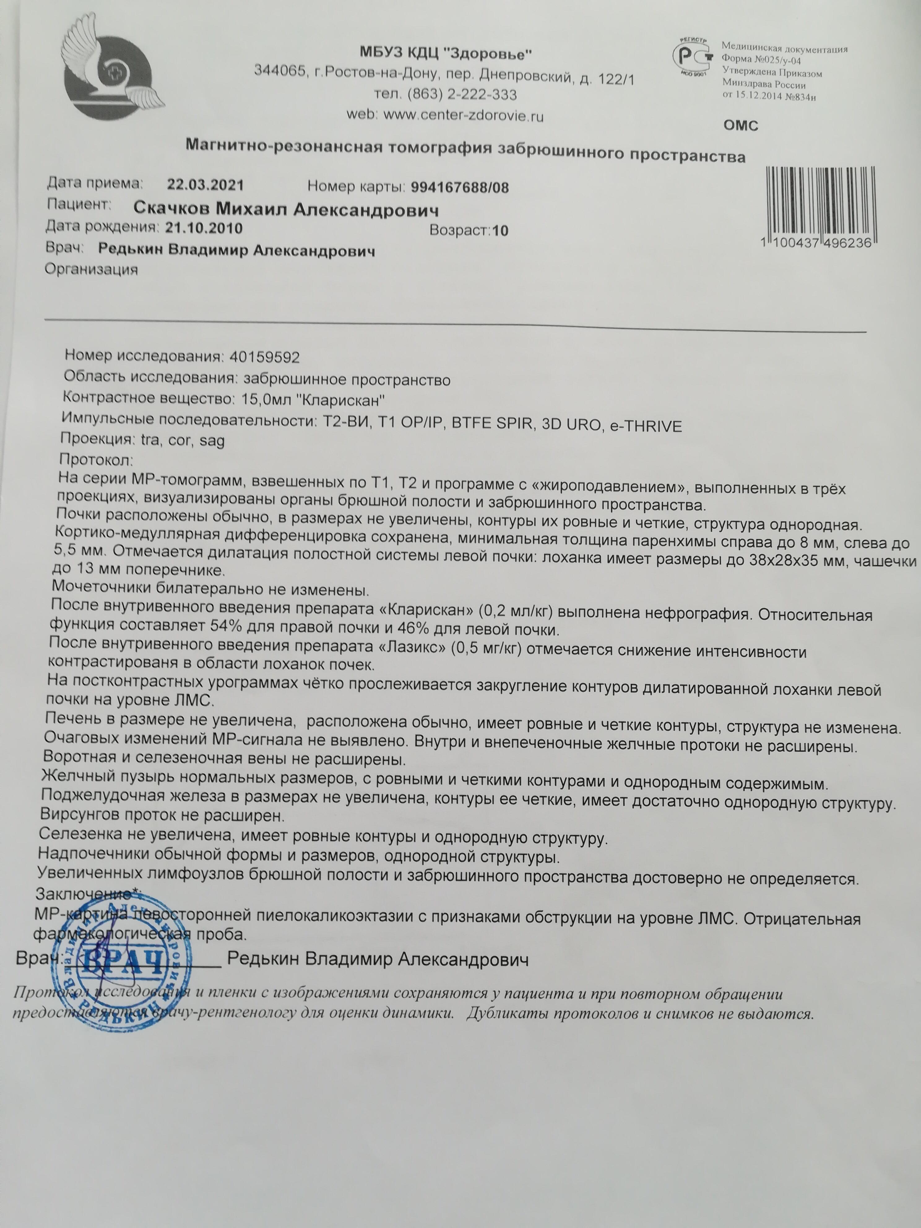 Здравствуйте! Моему сыну 10 лет. Во время беременности у плода был выявлен гидронефроз левой почки. После рождения диагноз подтвердился. Наблюдаемся у нефролога и уролога. Последнее УЗИ показало отрицательную динамику, сделали МРТ И реносцинтиграфию. Рекомендовано оперативное лечение. Все анализы мочи, крови в норме. Хотелось услышать Ваше мнение. Прилагаю фото Заключения реносцинтиграфии за 2015 и 2021 гг., а также заключение МРТ. С уважением, Мария