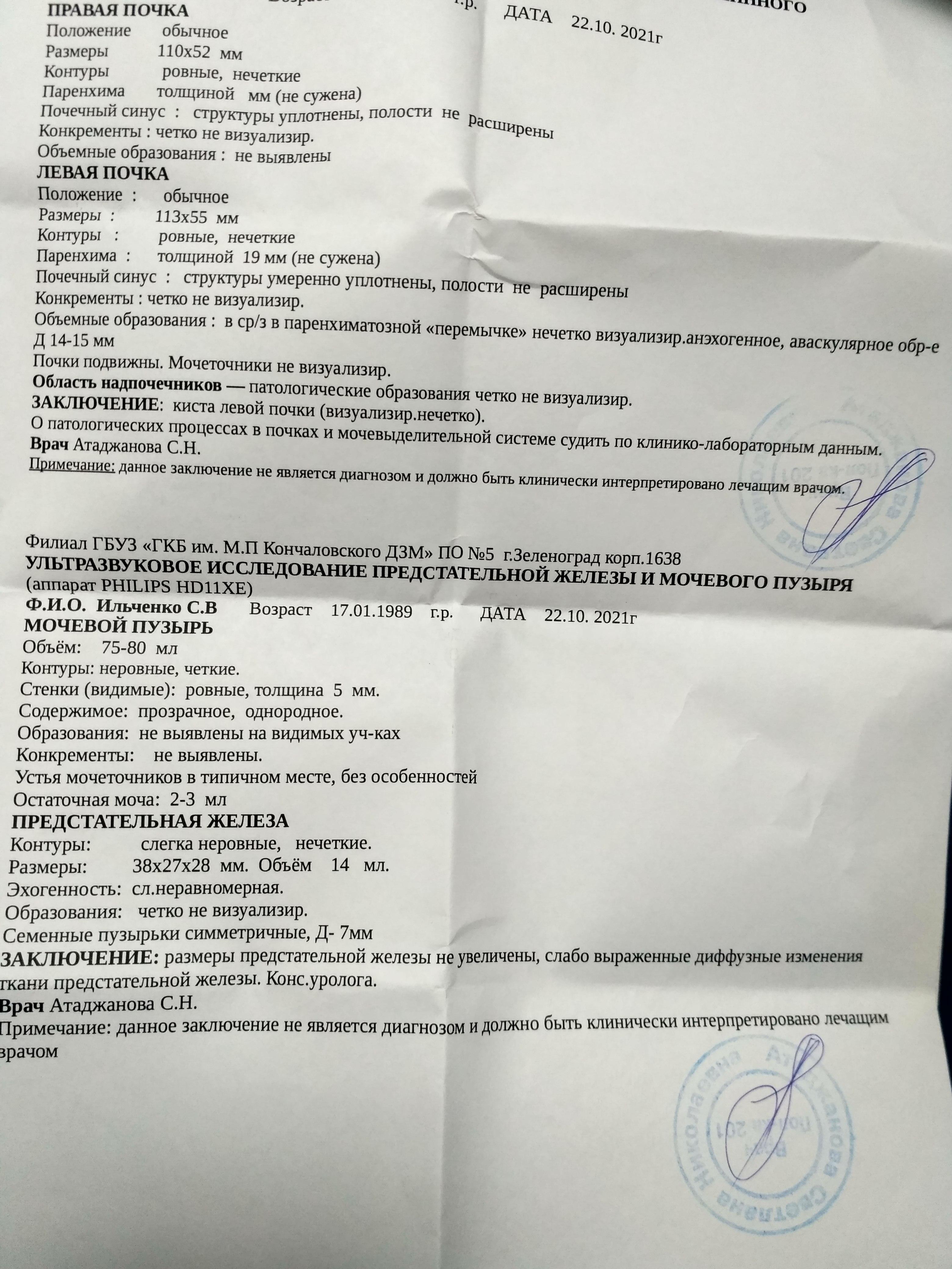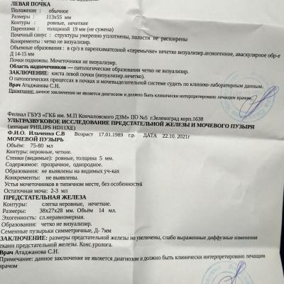 По результатам УЗИ почек - выявлено образование левой почки (киста?). По этому поводу я бы рекомендовала сделать МСКТ почек с контрастом( обсудите этот вопрос с Вашим урологом) - для уточнения характера образования.