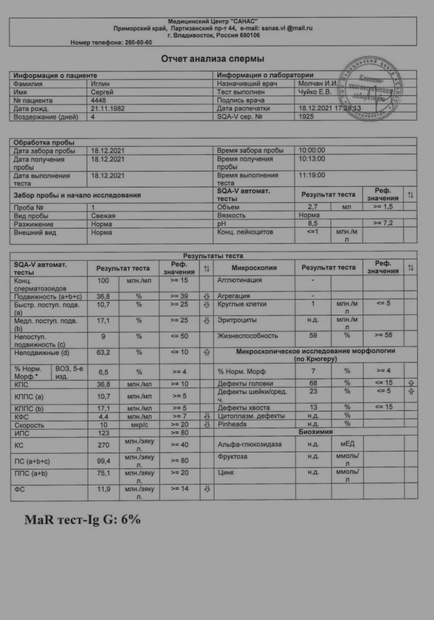 Здравствуйте подскажите пожалуйста результаты анализа насчет подвижности спермотозоидов расшифровка более подробно узнать