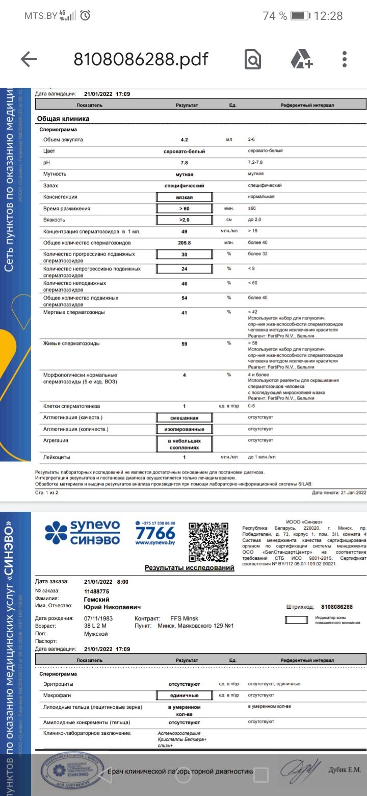 Здравствуйте! По данным спермограммы - снижение подвижности, уровень лейкоспермии - на верхней границе( что обусловливает агглютинацию и агрегацию), что, в свою очередь , может вызывать снижение подвижности. Надо сделать анализ спермы на бакпосев. По результатам - оценивать целесообразность назначения антибактериальной терапии. Для улучшения качества спермы можем рекомендовать курсовой приём комплекса Мираксант. Удачи!