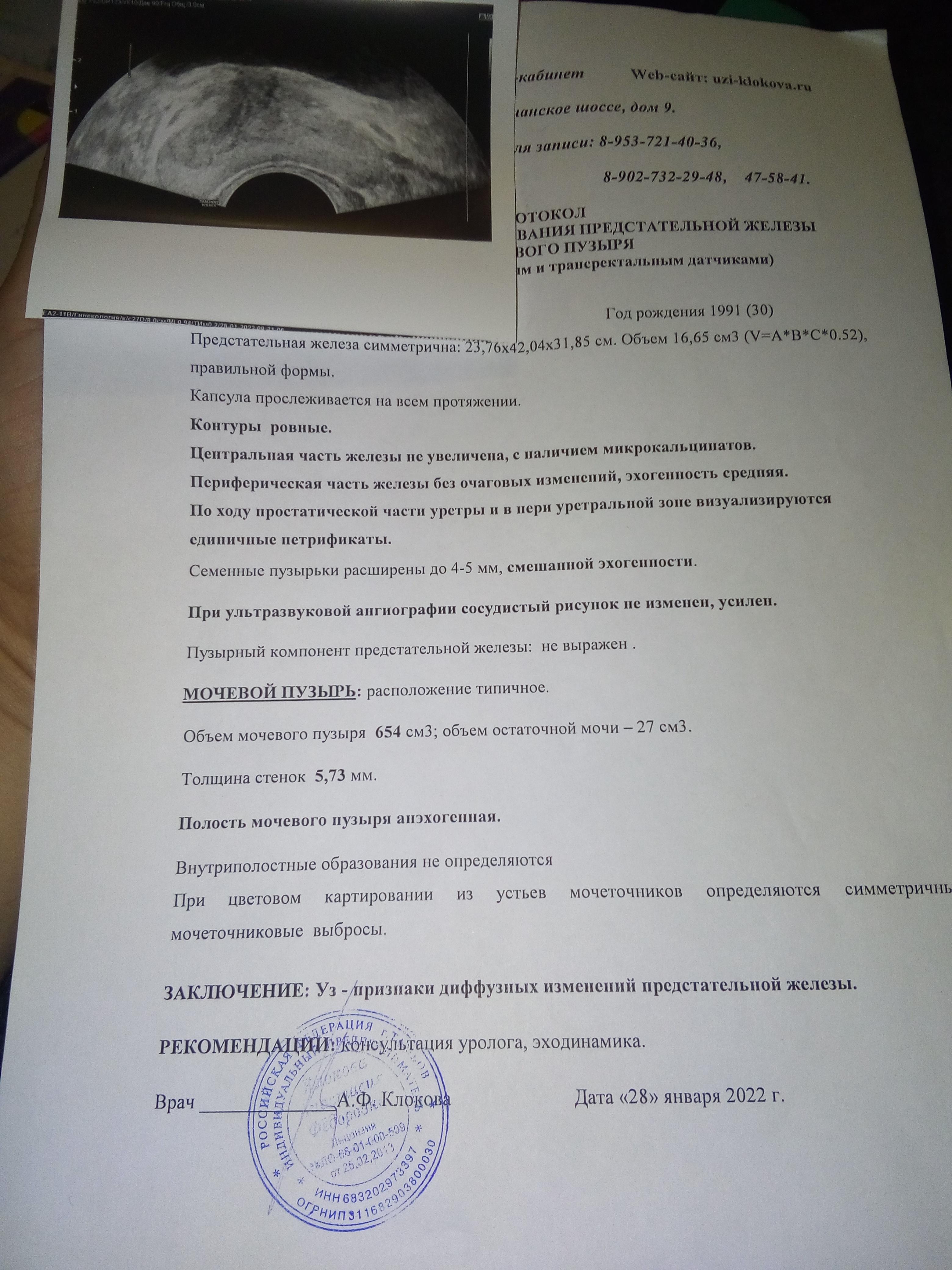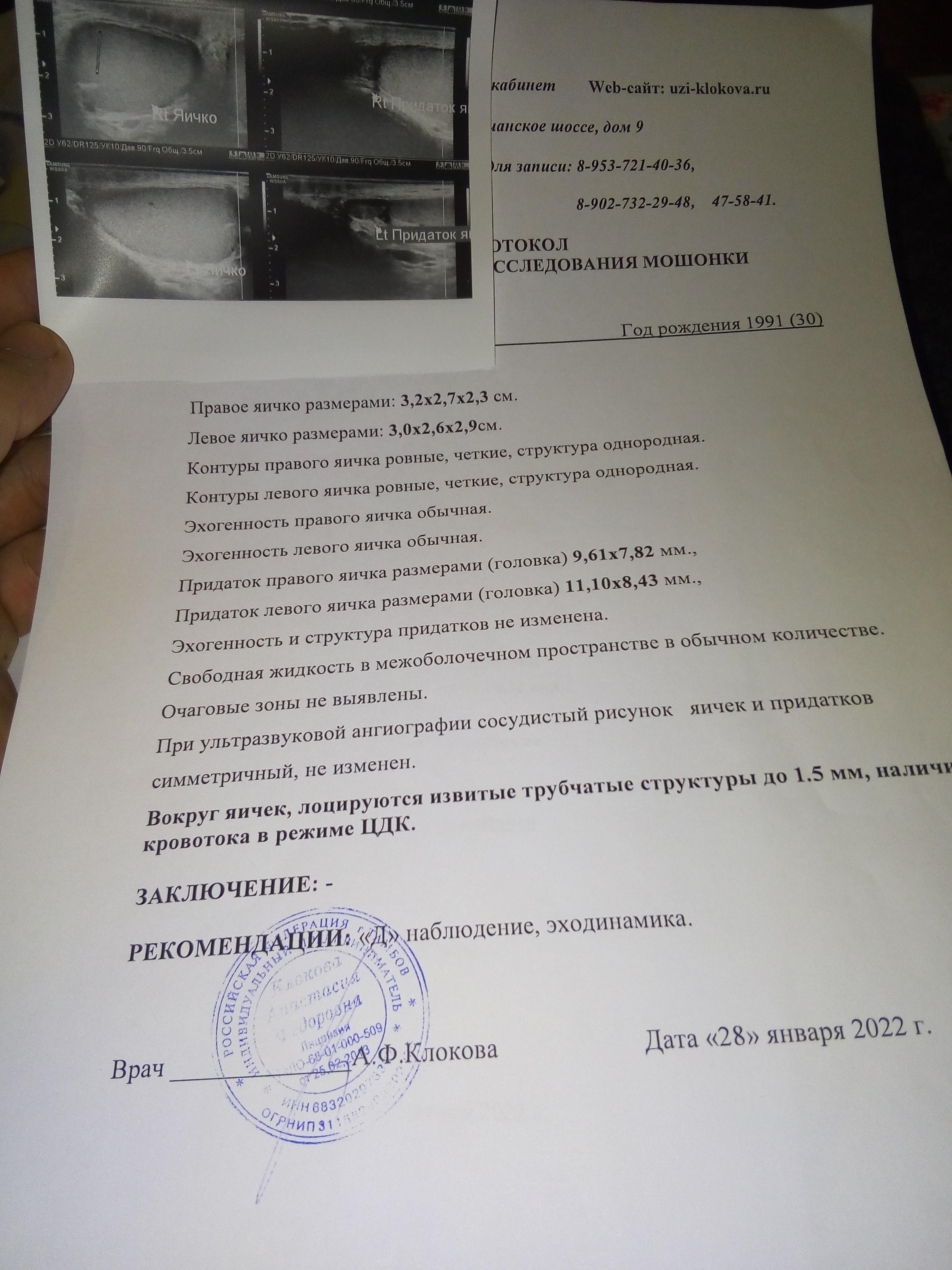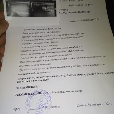 Здравствуйте! По УЗИ органов мошонки - похоже на наличие варикоцеле(?) - сделать УЗДГ сосудов мошонки. Также надо сделать анализ спермы на бакпосев. По результатам возможно повторное обращение. Удачи!